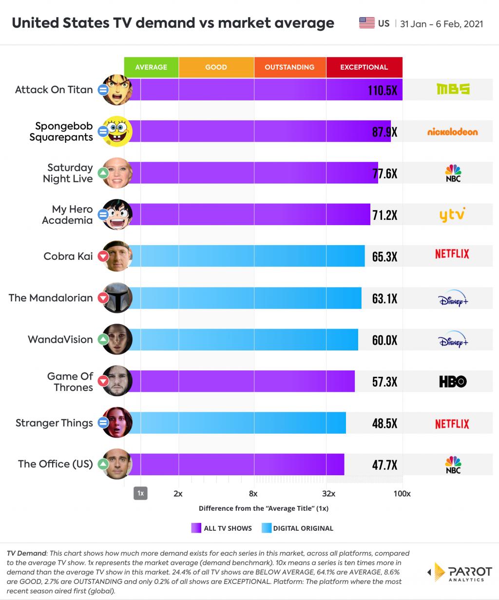 Como podemos observar, Shingeki no Kyojin se encuentra por encima de programas como: Spongebob Squarepantsย (Bob Esponja), Saturday Night Live, Cobra Kai,ย The Mandalorianย yย WandaVision. Ademรกs, cabe destacar que tambiรฉn el anime Boku no Hero Academiaย se encuentra en la cuarta posiciรณn con 71.2 veces la audiencia promedio.