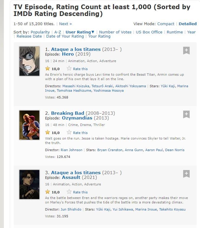 El portal imdb clasificó al séptimo episodio del anime Shingeki no Kyojin: The Final Season (Attack on Titan: The Final Season) como el tercer mejor episodio en la historia de la televisión.