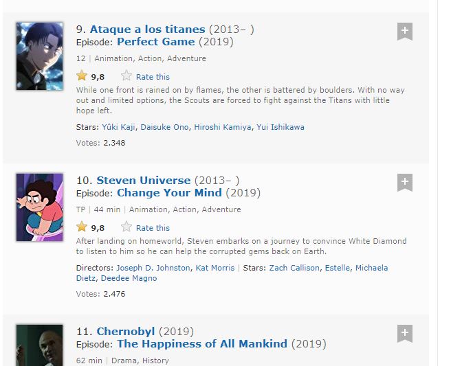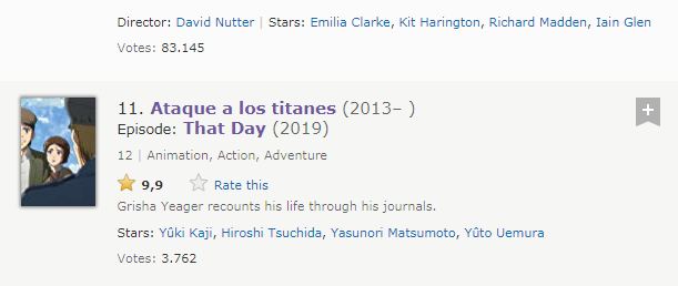 Por lo que podemos decir que durante unas horas, Shingeki no Kyojin tenรญa los tres mejores episodios de la historia de la televisiรณn.ย El anime aun sigue emisiรณn y estamos seguros que podrรก posicionar un nuevo episodio como lo mejor de la televisiรณn.