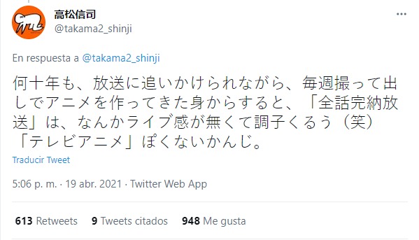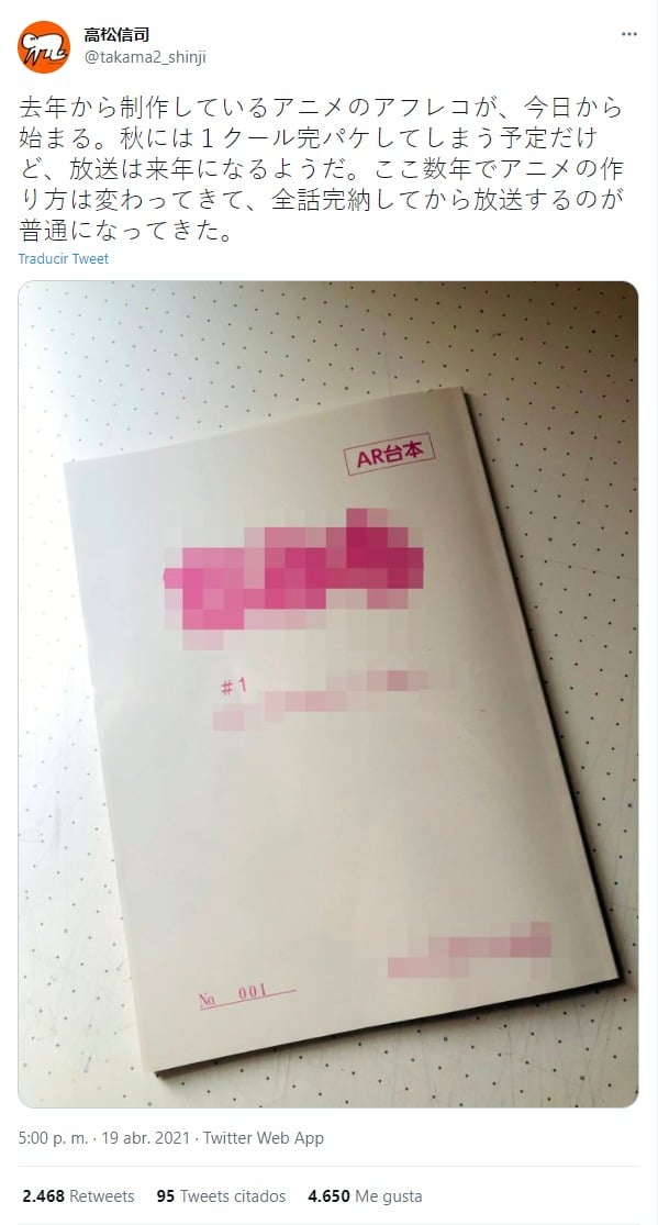 Mediante su cuenta oficial en Twitter, el director Shinji Takamatsu dio a conocer que estaba trabajando en su nuevo proyecto de animación. Además, también nos habla un poco sobre cómo la producción del anime ha cambiado durante los últimos años.