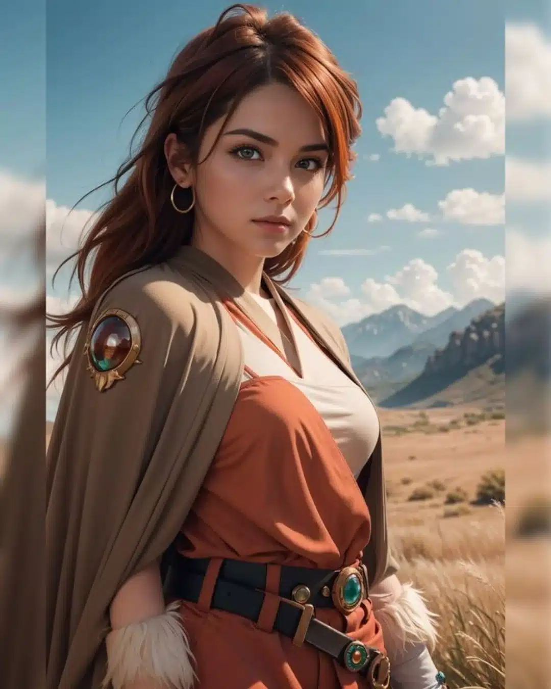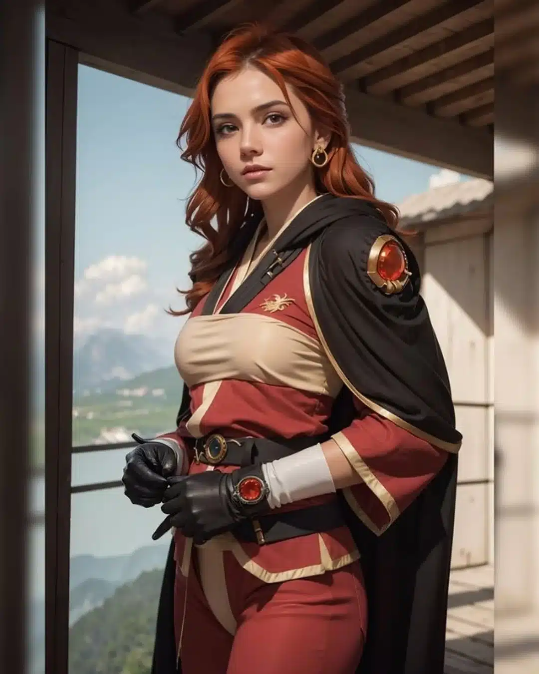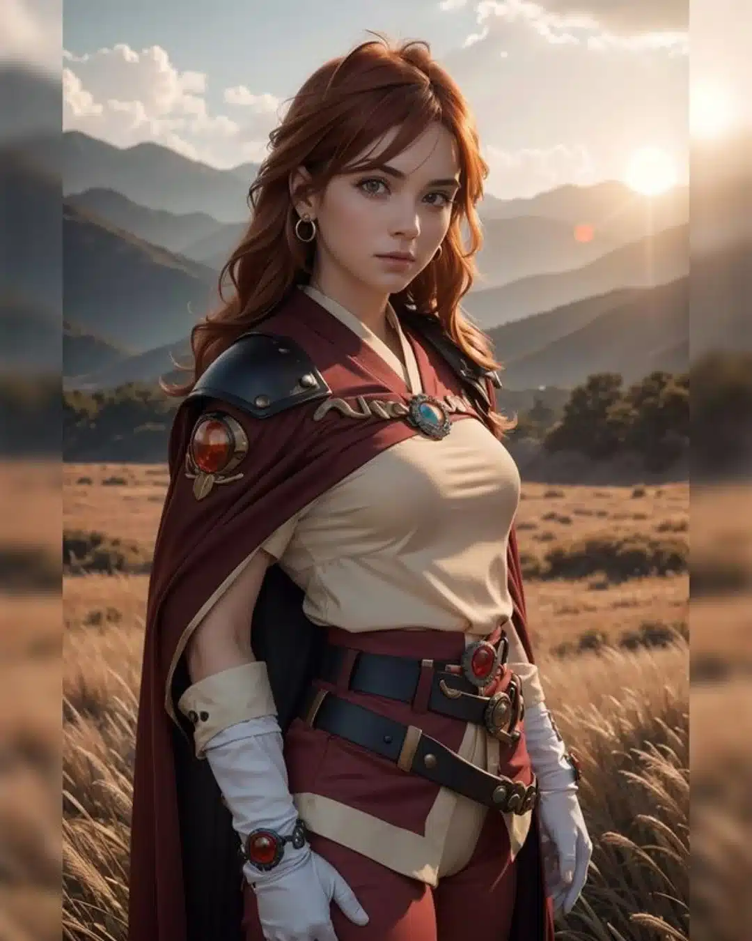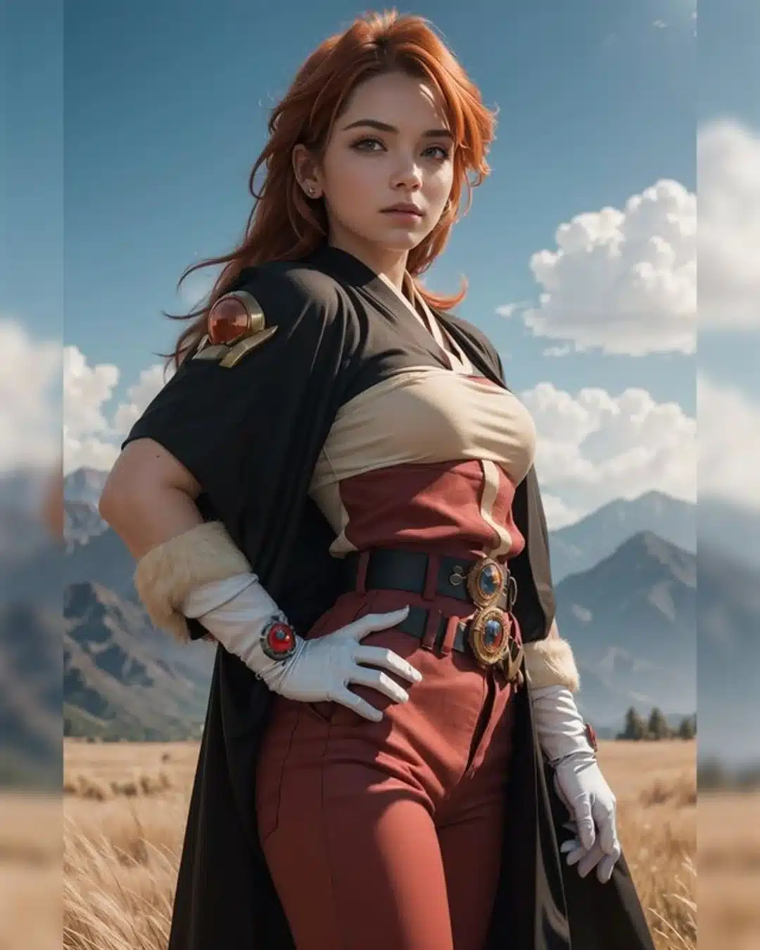 De este combo de ilustraciones, podemos decir que el atuendo y representación de Lina Inverse es un 95% parecido a la original protagonista de Slayers. Si nos ponemos meticulosos y detallistas, la versión realista de la hechicera no trae puesta la banda negra en la frente, tampoco está usando sus grandes aretes amarillos, y sus ojos parecen ser más en tonos azules y grisáceos que el clásico tono marrón rojizo de la hechicera, esos son detalles característicos del personaje que la IA no pudo plasmar.