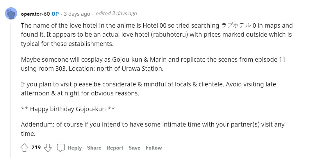 Tal vez alguien se disfrace de Gojou-kun y Marin y replique las escenas del episodio 11 usando la habitación 303. Ubicación: al norte de la estación de Urawa.