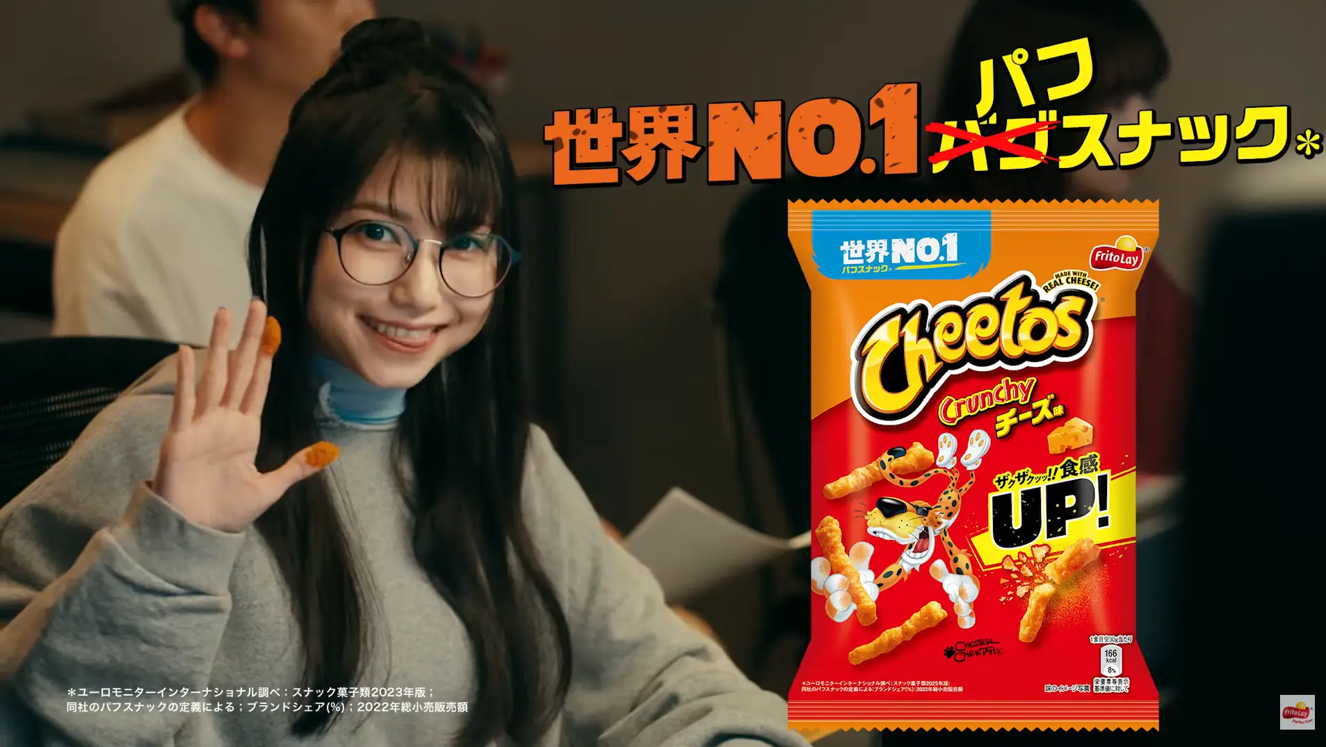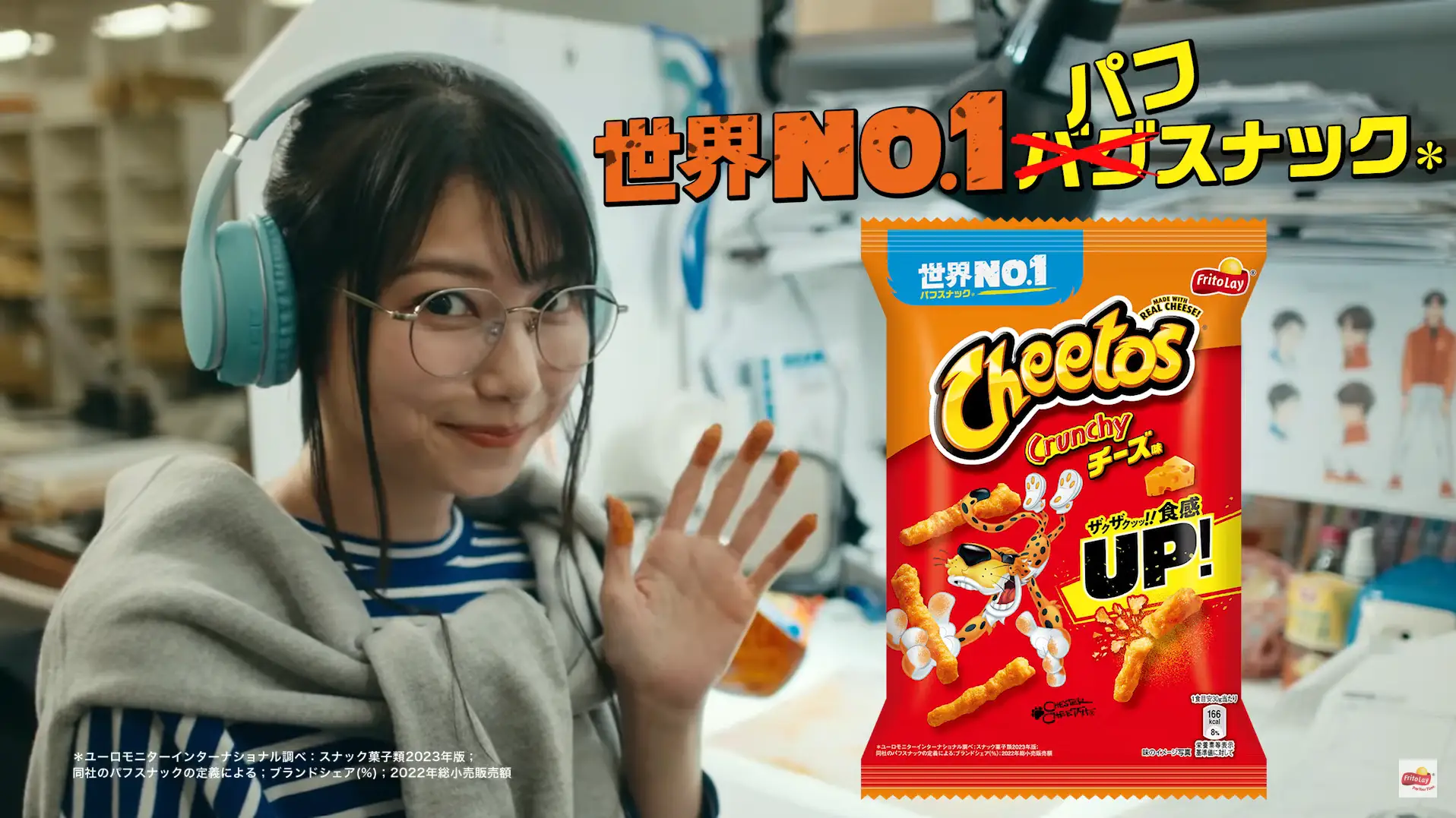 En el primer comercial vemos como Sora Amamiya se encuentra en una oficina trabajando como animadora que al momento tiene los dedos llenos de Cheetos, lo que al ver el panel que entrego a sus compañeros logra añadir un toque especial a una escena en la que trabajo, todo por llenar el panel de sus dedos llenos de cheetos, lo que creo una escena muy linda en la que podemos disfrutar de su cautivante sonrisa.