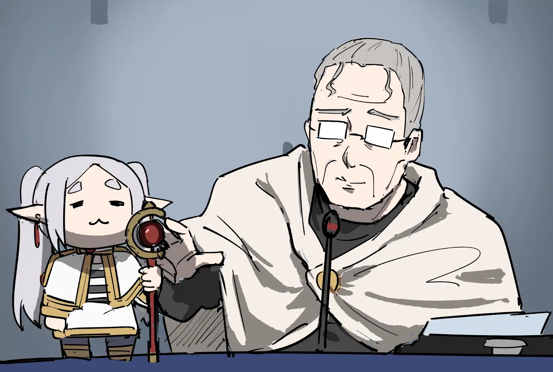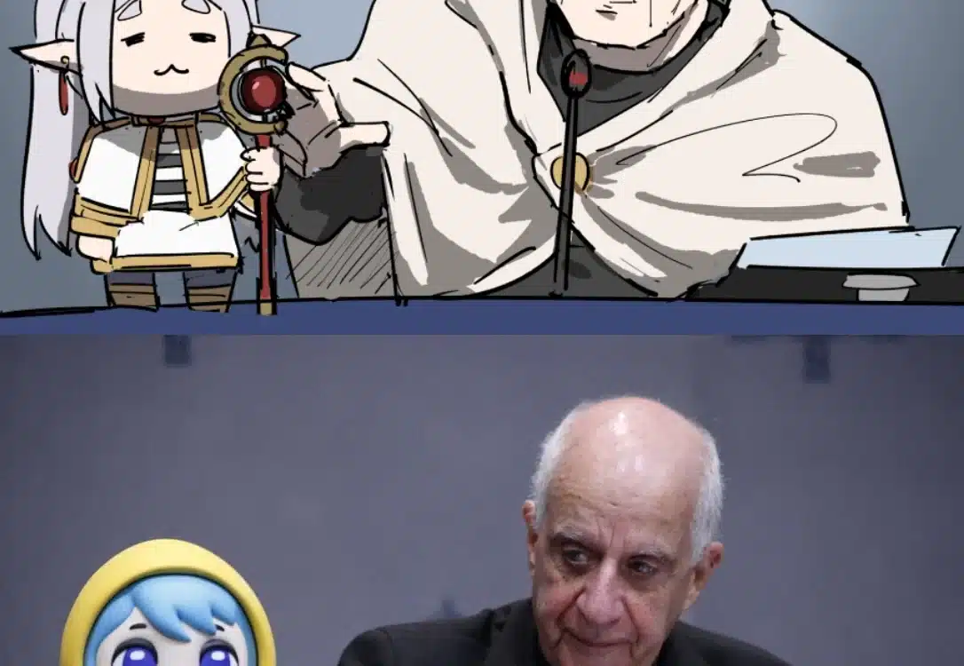 Esta parodia fue presentada en la red social X por el usuario tenten (@tentenchan2525) y en ella podremos ver como la habilidosa Frieren toma el lugar de Luce, mientras que Heiter toma el lugar del arzobispo Fisichella.