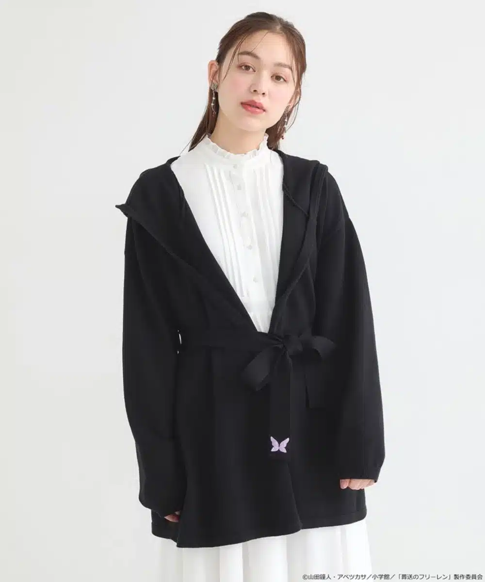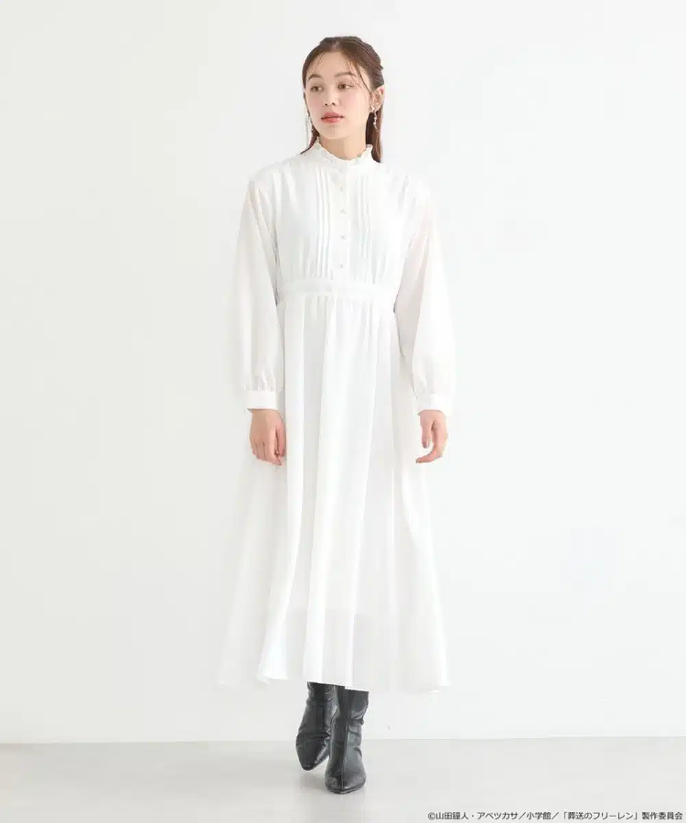 La protagonista, Frieren, cuenta con un vestido inspirado directamente en su ropa del anime. Este vestido se acompaña de una capa removible y un cinturón de tela. Estos complementan su estética tranquila y mística. Además, el conjunto incluye unos pendientes estilizados que evocan su característico bastón de hechicera.