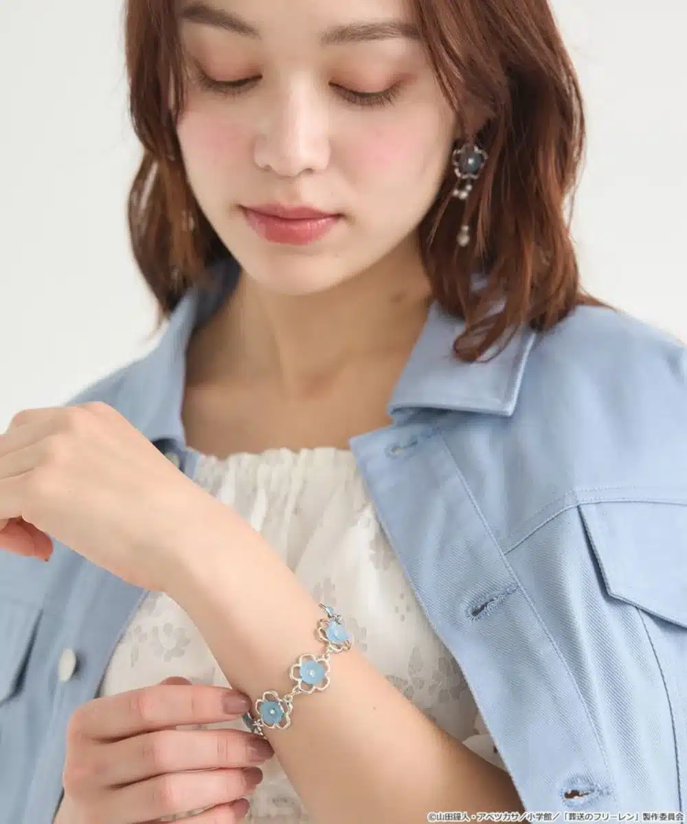 Uno de los elementos más poéticos del universo de Frieren: Beyond Journey’s End es la flor Blue Moon Weed. Es una especie ficticia que representa recuerdos perdidos y momentos imborrables de la protagonista con Himmel. La colaboración rinde homenaje a esta flor con un conjunto de joyería delicada y etérea. Captura el misticismo que rodea esta planta dentro del anime.