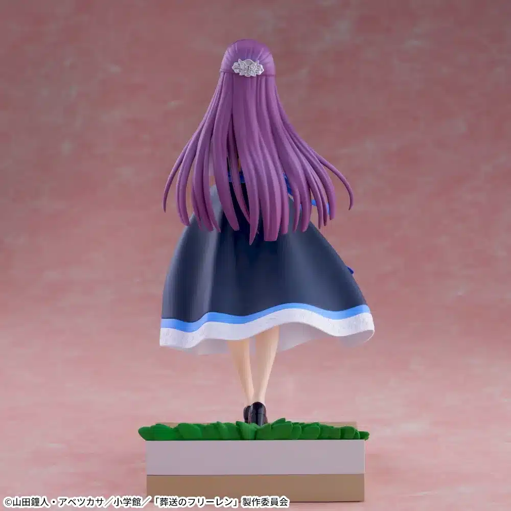 La figura de Fern, titulada Sousou no Frieren XStellar Fern ~En cierto festival~. Opta por un diseรฑo mรกs sereno y tradicional en comparaciรณn con la figura de Frieren. Su atuendo incluye una blusa blanca de manga larga con cuello fruncido. Un corsรฉ azul oscuro y una falda larga con capas y bordes decorativos que reflejan fielmente la estรฉtica del estilo dirndl. A diferencia de la postura de Frieren, Fern permanece de pie con una presencia calmada, sosteniendo con ambas manos un aro de flores blancas frente a su pecho.