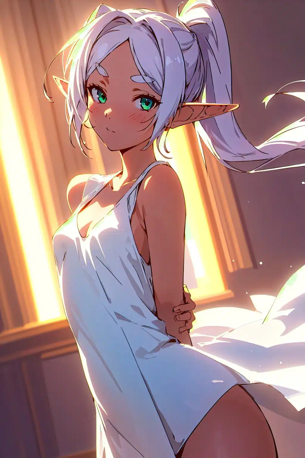 Una vez más Frieren vuelve a causar sanción y ahora lo hace gracias al usuario en X antes Twitter llamado «@AIVirgenMorena» quien nos muestra como se vería la protagonista de «Sousou no Frieren» en «versión mexicana», vale recordar que este usuario se ha vuelto viral en muchas ocasiones al mostrarnos como se verían diferentes «waifus» de anime si fueran «mexicanas» y esto lo hace a través de la generación de imágenes con inteligencia artificial. En las ilustraciones podemos ver a una Frieren de piel morena vistiendo diferentes atuendos en color blanco, en la primera imagen es un vestido que la hace lucir muy linda y atractiva.