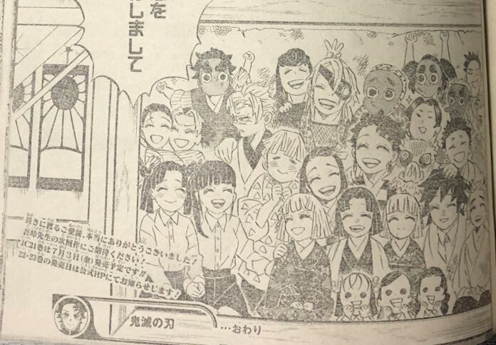Como previamente se había anunciado, el manga Kimetsu no Yaiba estaba programado para finalizar a mediados de junio. Teniendo como final el capitulo 205, y aunque aún no ha salido a la venta oficialmente, se han viralizado imágenes sobre el final.