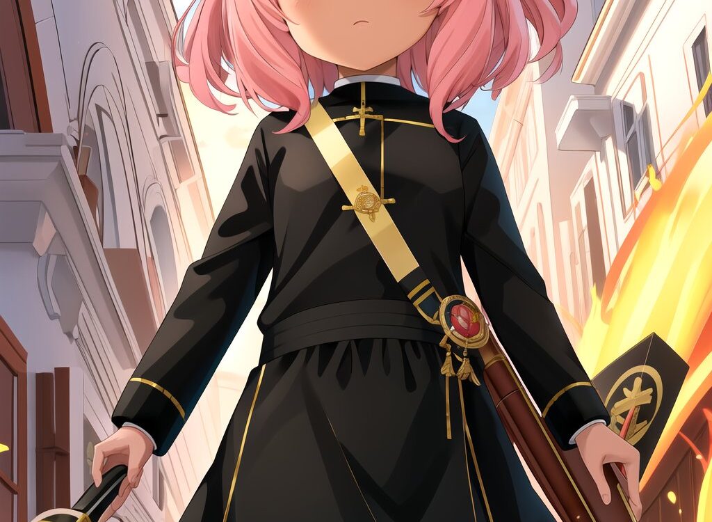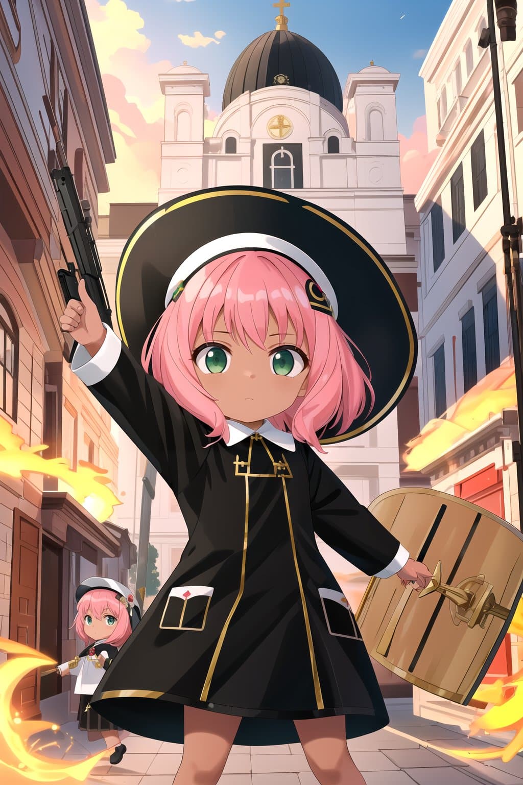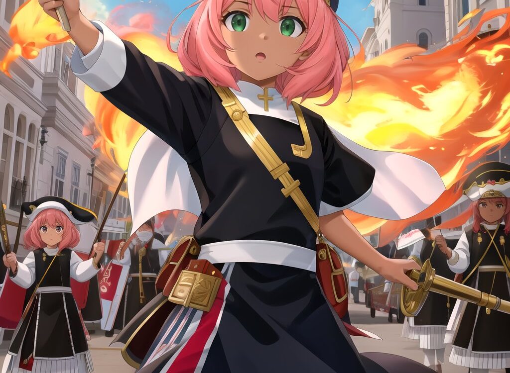 También se puede notar en algunas imágenes que se llegan a presentar algunos errores que se pueden ver a simple vista o que nos hace confundirnos, como lo es el caso de la segunda imagen que no sabemos de donde está sosteniendo la bandera el personaje, o el simple hecho de que en el fondo todas las personas son anita replicada, pero dejando de fuera estos detalles el diseño que se le realizó a Anya en esta versión llega a ser muy sorprendente, ya que si representa al personaje en ciertos aspectos, a pesar de los cambios que le han hecho y logra ser un buen trabajo.