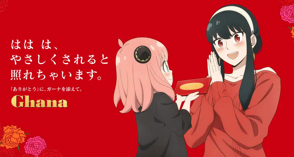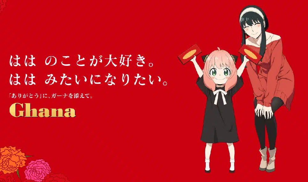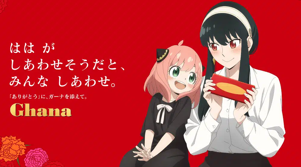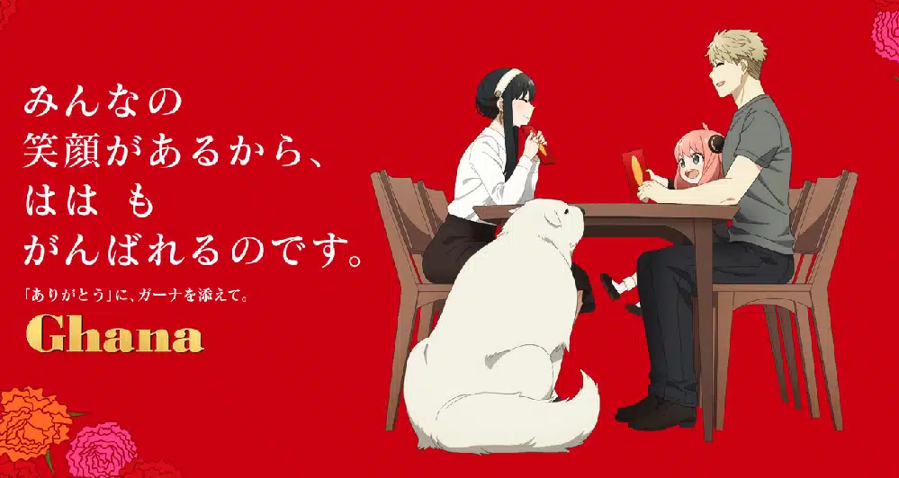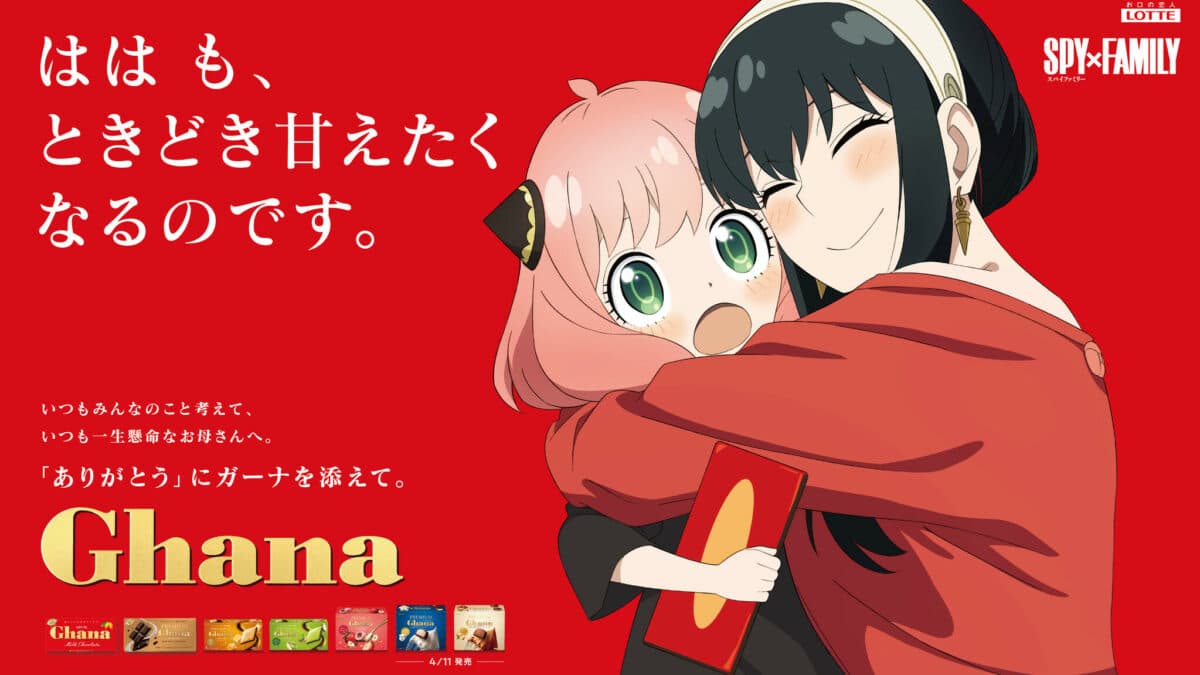 La colaboración de SPY X FAMILY y la marca de bombones Ghana con motivo del día de las madres comenzó el pasado 4 de abril de 2023. Dicha colaboración lleva por eslogan «Las mamás a veces también quieren que las mimen», y es protagonizado por los Forger, dando especial énfasis a Yor Forger, la madre y esposa de la familia más divertida del anime.