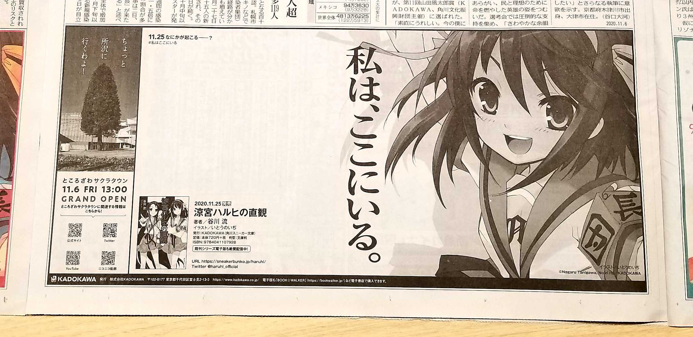 La cuenta oficial de Twitter para la novela ligera Suzumiya Haruhi no Yuutsu anunció que Haruhi Suzumiya apareció el 6 de noviembre en varios periódicos de Japón para promocionar el lanzamiento del nuevo volumen.