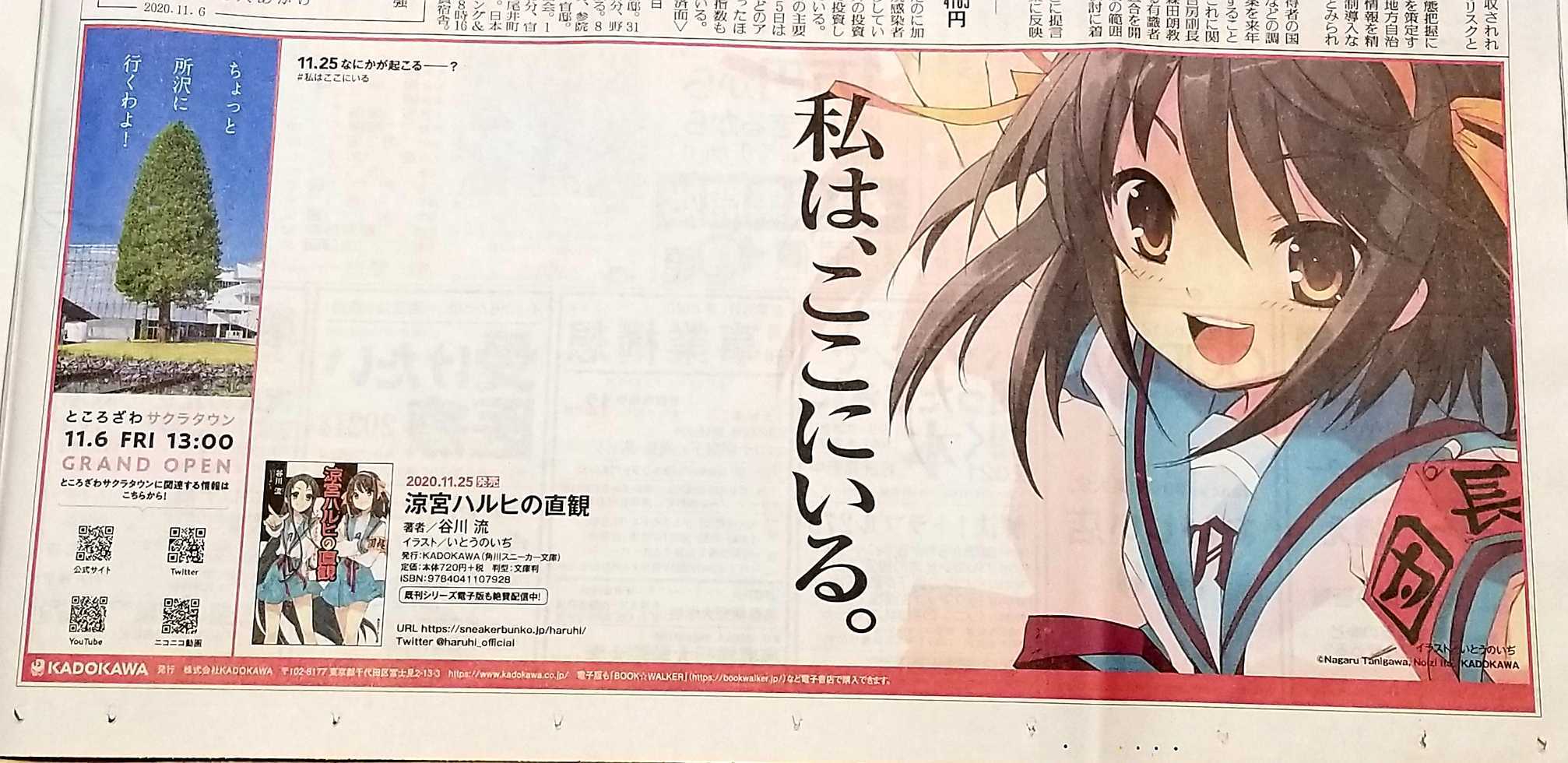 La cuenta oficial de Twitter para la novela ligera Suzumiya Haruhi no Yuutsu anunció que Haruhi Suzumiya apareció el 6 de noviembre en varios periódicos de Japón para promocionar el lanzamiento del nuevo volumen.