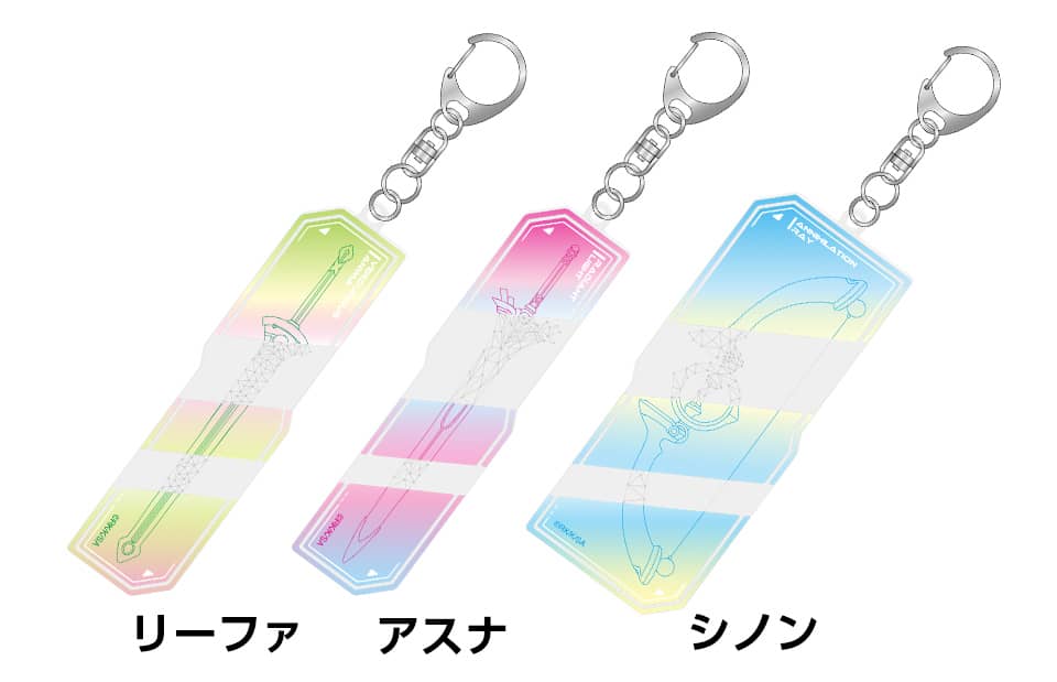 Una colecciรณn de llaveros de acrilico con ilustraciones inspiradas en las armas que utilizan las chicas, cada una por 1,980.
