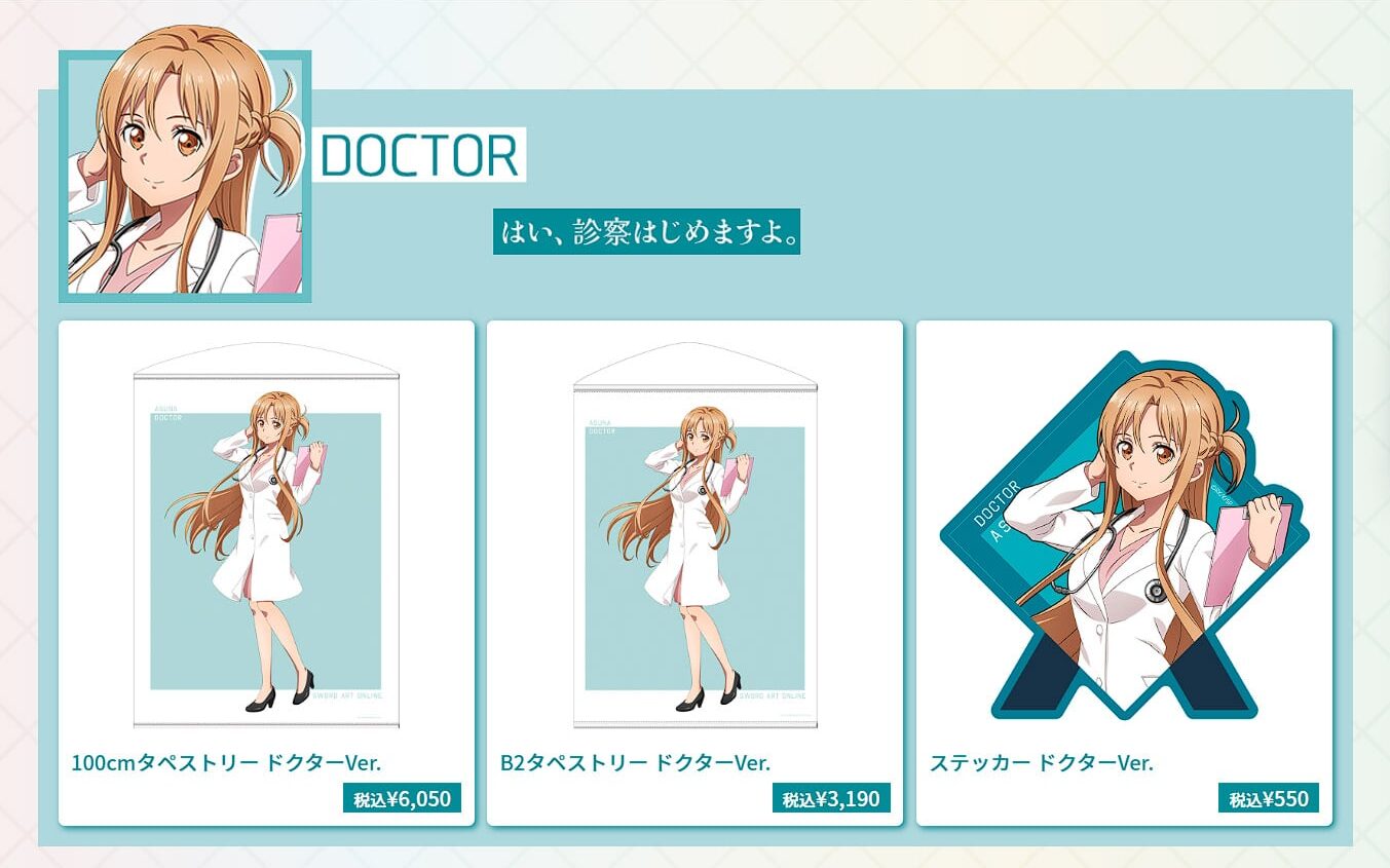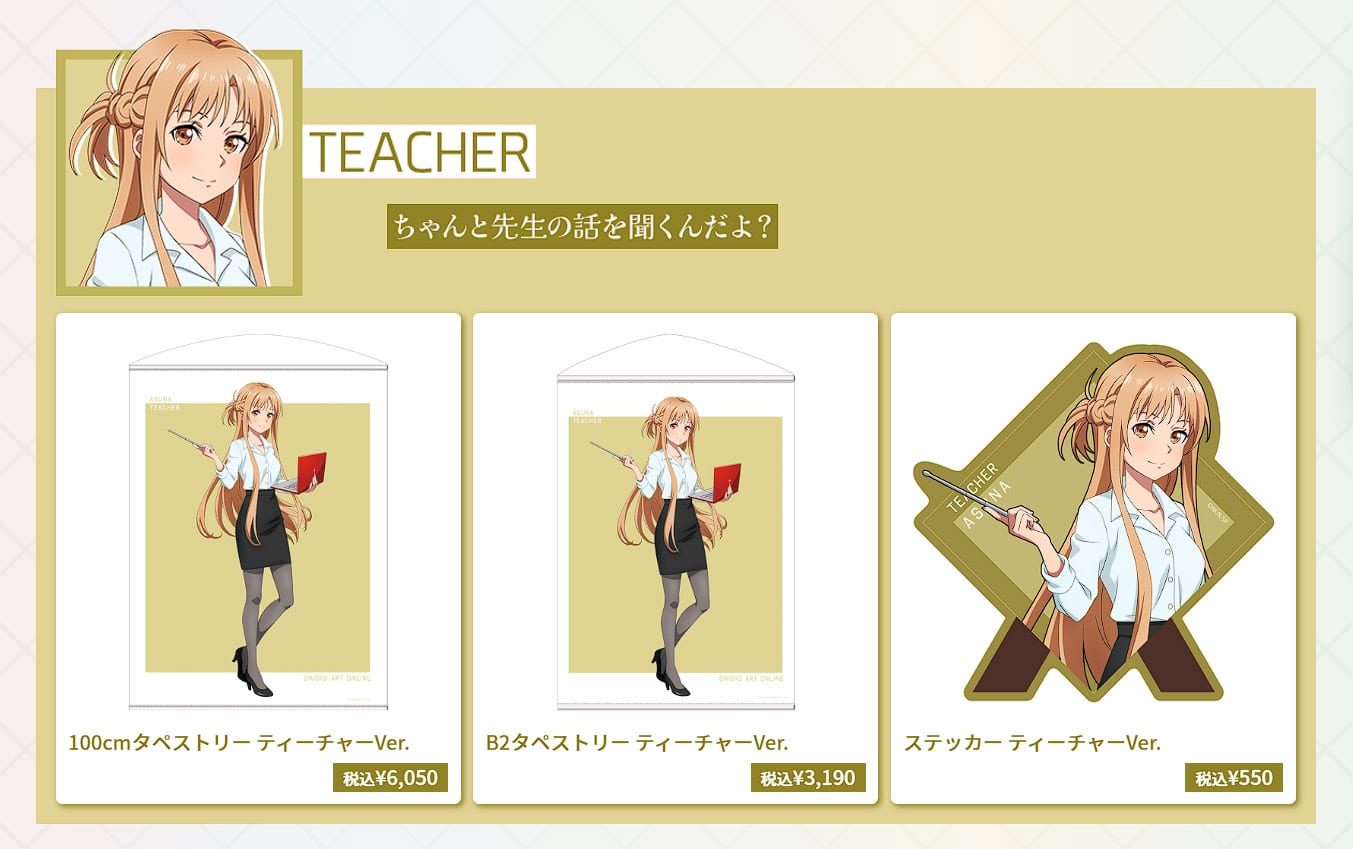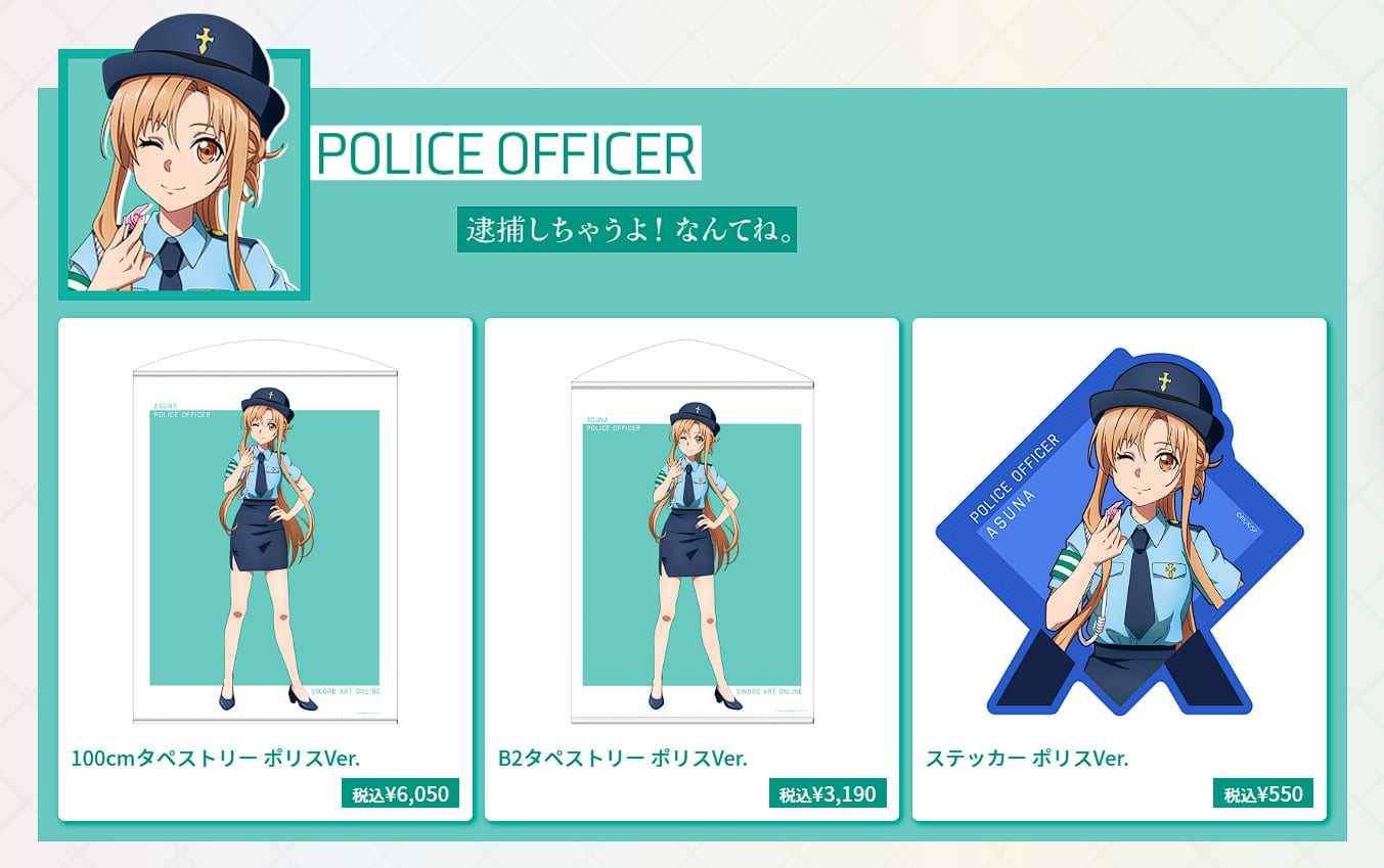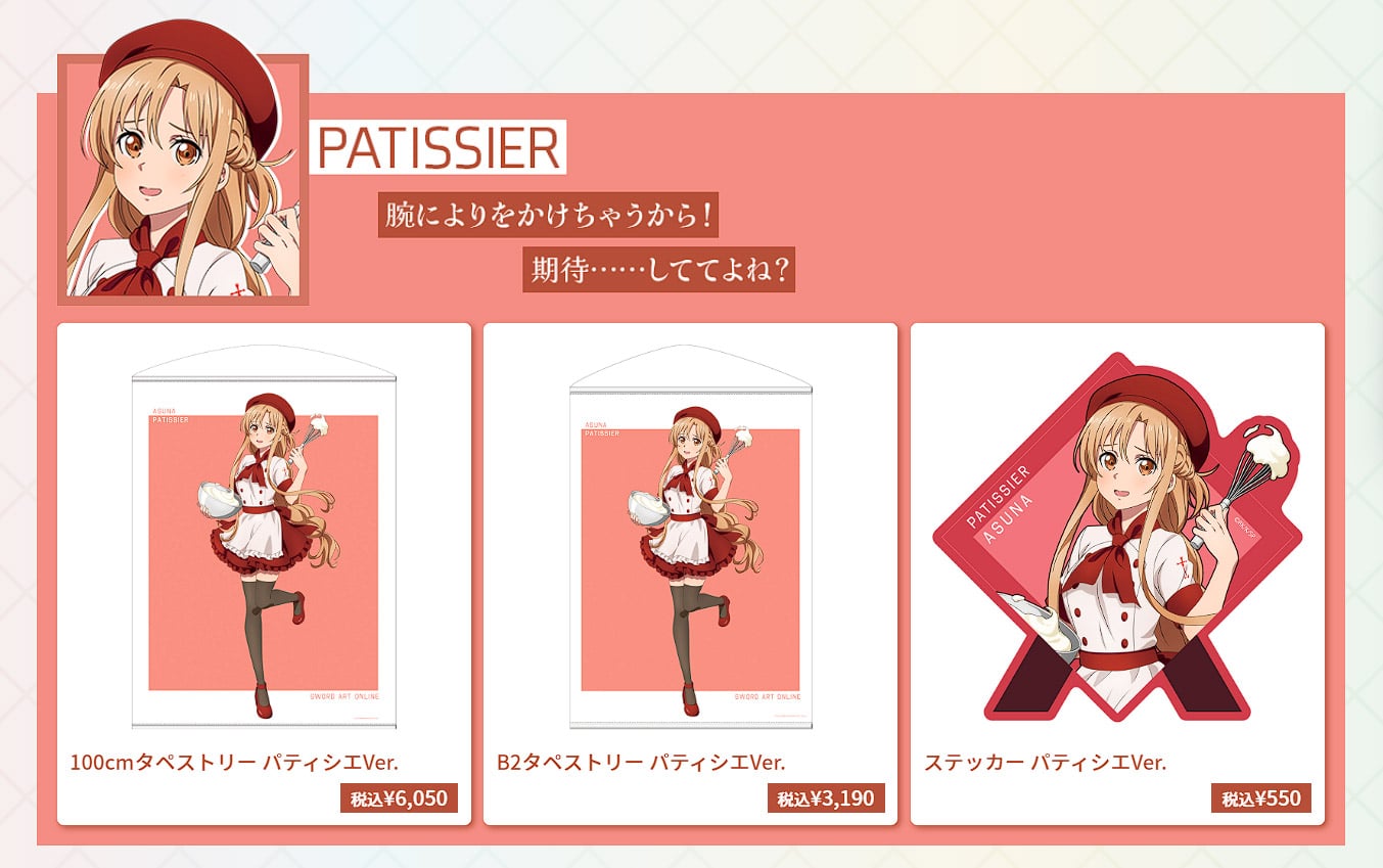 En esta ocasión, quien decidió realizar una colaboración con el anime Sword Art Online fue la compañia COSPA, y por medio de su sitio web oficial, presentó al público una gran variedad de productos inspirados en la apreciada waifu «Asuna Yuuki«, quien mostrará su habilidad en el «cosplay» al vestir diferentes atuendos como oficial de policía, enfermera, maestra y chef pastelera (Patissier).