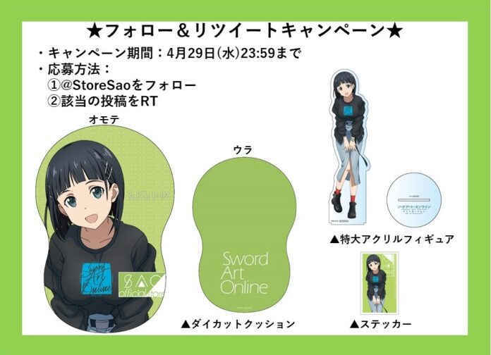 Por otro lado, la cuenta de Twitter oficial de la adaptación al anime de SAO reveló un concurso en Twitter para ganar una pegatina, un cojín y una figura de acrílico con soporte de Suguha. El cual para participar solo tienes que compartir la publicación con una fecha límite de hasta el 29 de abril.