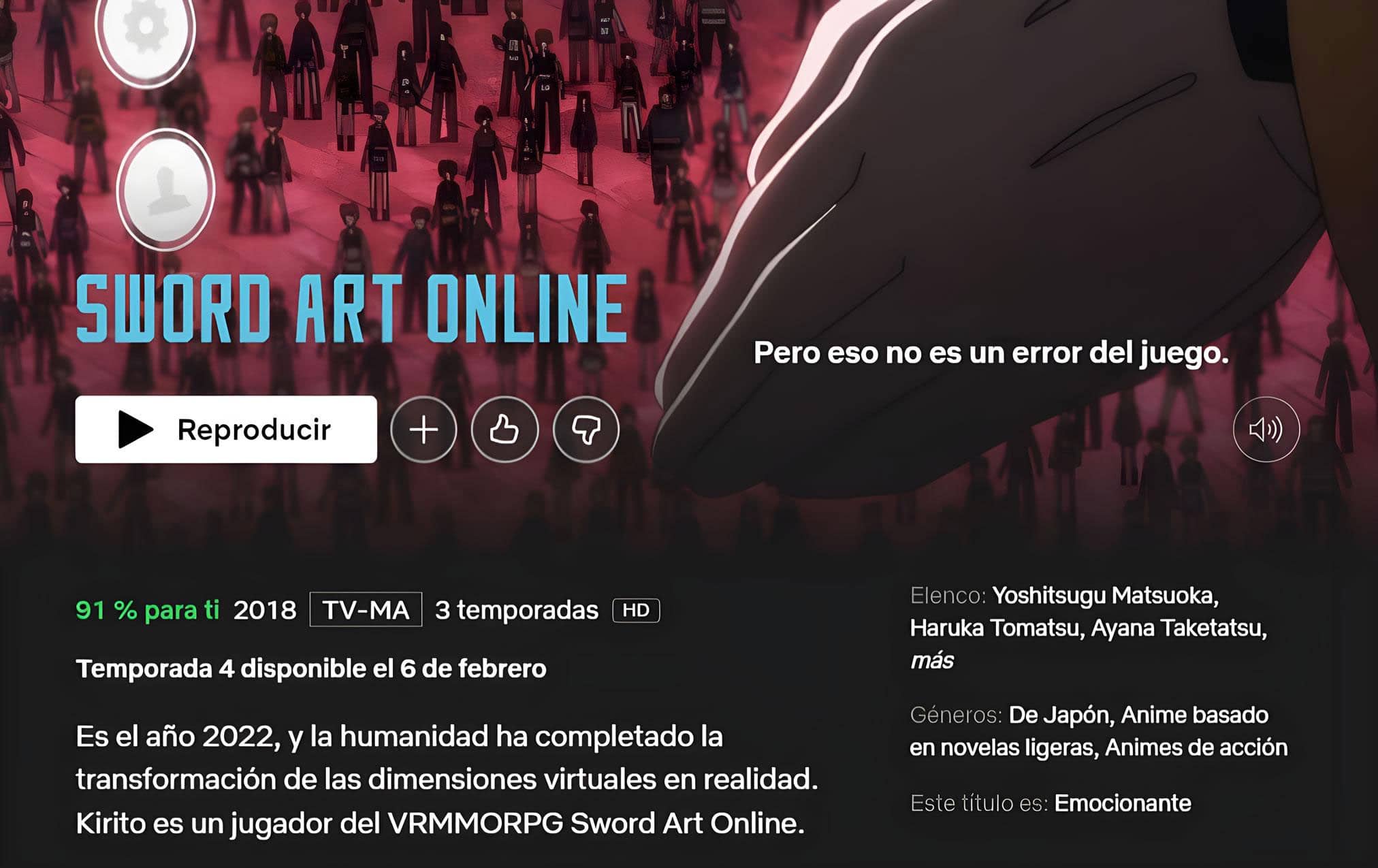 Según un reporte realizado en una actualización en el catálogo de series para la plataforma Netflix, se confirmó que el anime «Sword Art Online: Alicization – War of Underworld» estará disponible en la plataforma a partir del próximo 6 de febrero de este año. El anime contará con subtítulos al español, y es listado por Netflix como la «Temporada 4» del anime.