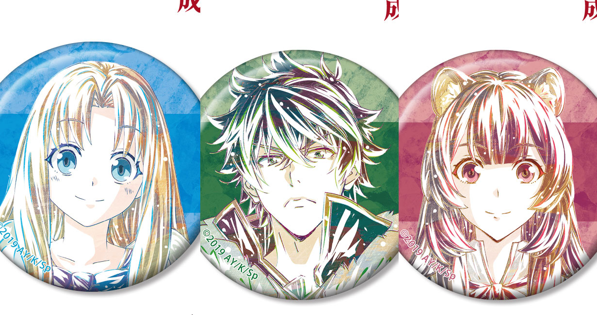 Pines con diseños de Naofumi, Raphtalia y Filo, por 1,000 yenes.