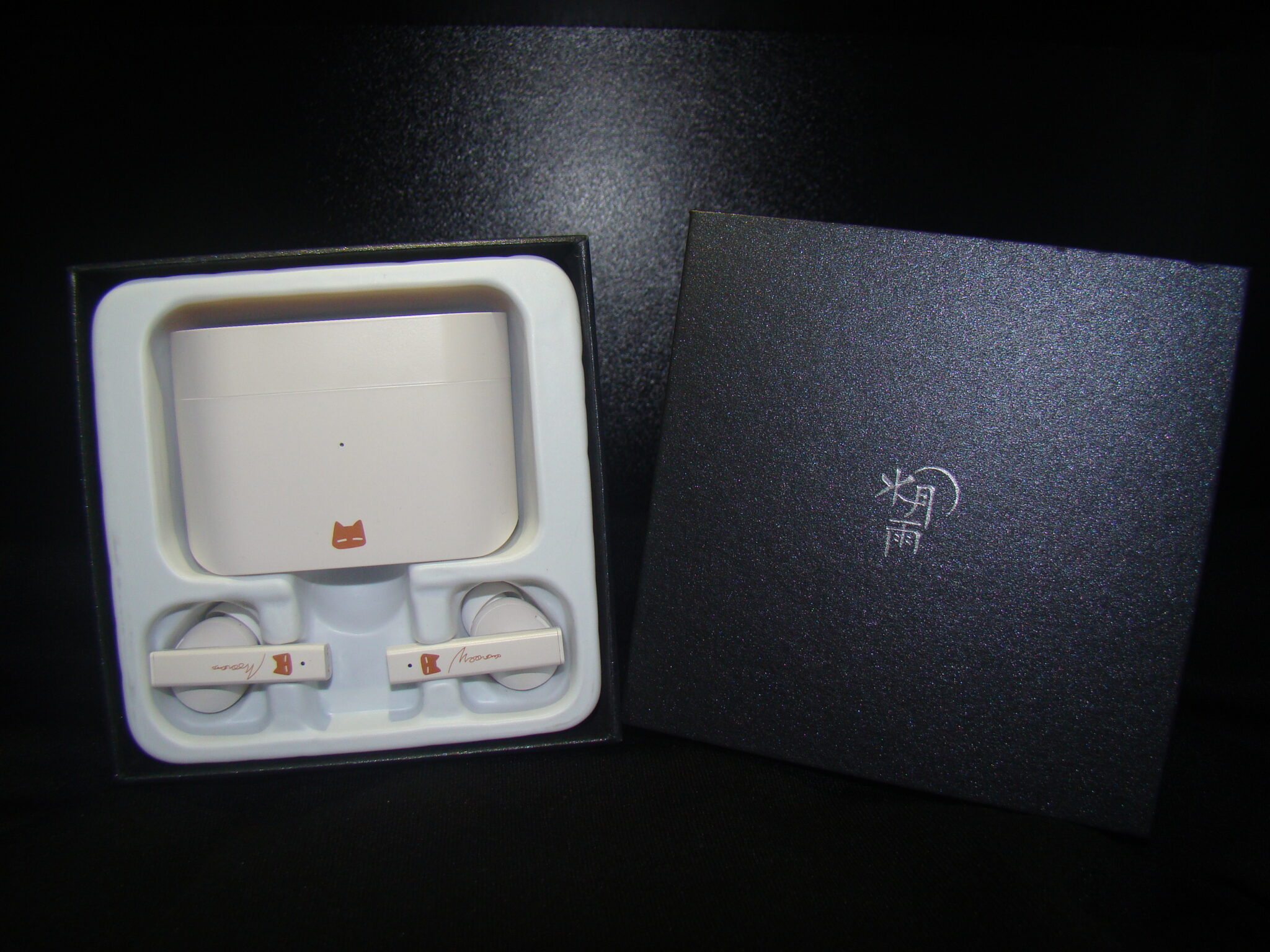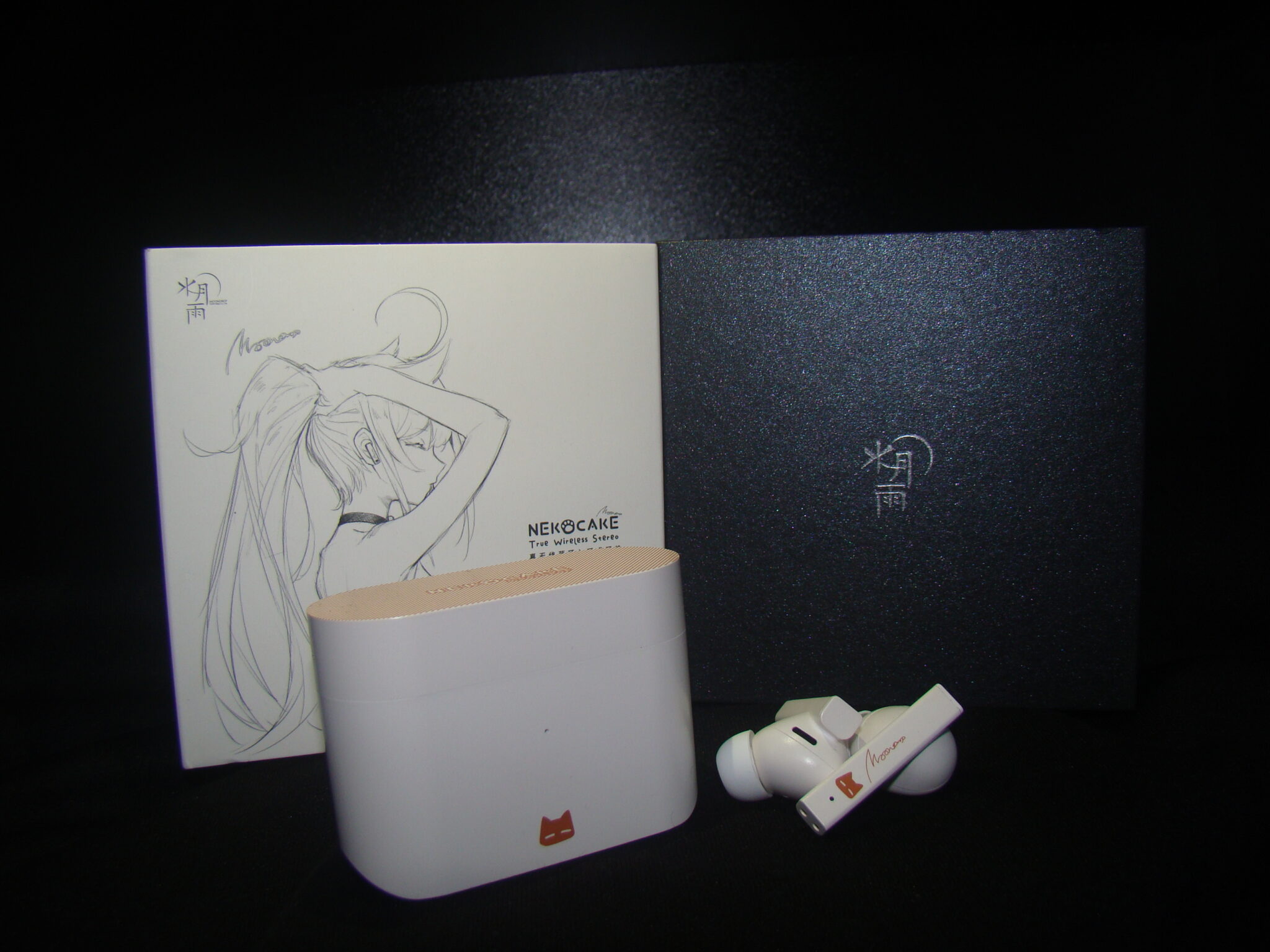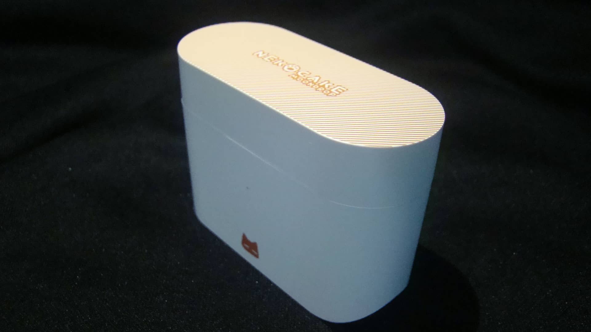 Estuche: El Nekocake presenta una pata de gato en la cubierta y una silueta en la parte inferior, en consonancia con el homónimo «Neko» (猫), que significa «gato» en japonés. Hay un fuerte color temático complementario con el estuche de transporte que combina estrechamente con los auriculares. Ambos están hechos de plástico blanco liso con detalles en oro rosa. Además de esto, el maletín Nekocake cuenta con un led que sirve como indicador de estado de los auriculares.