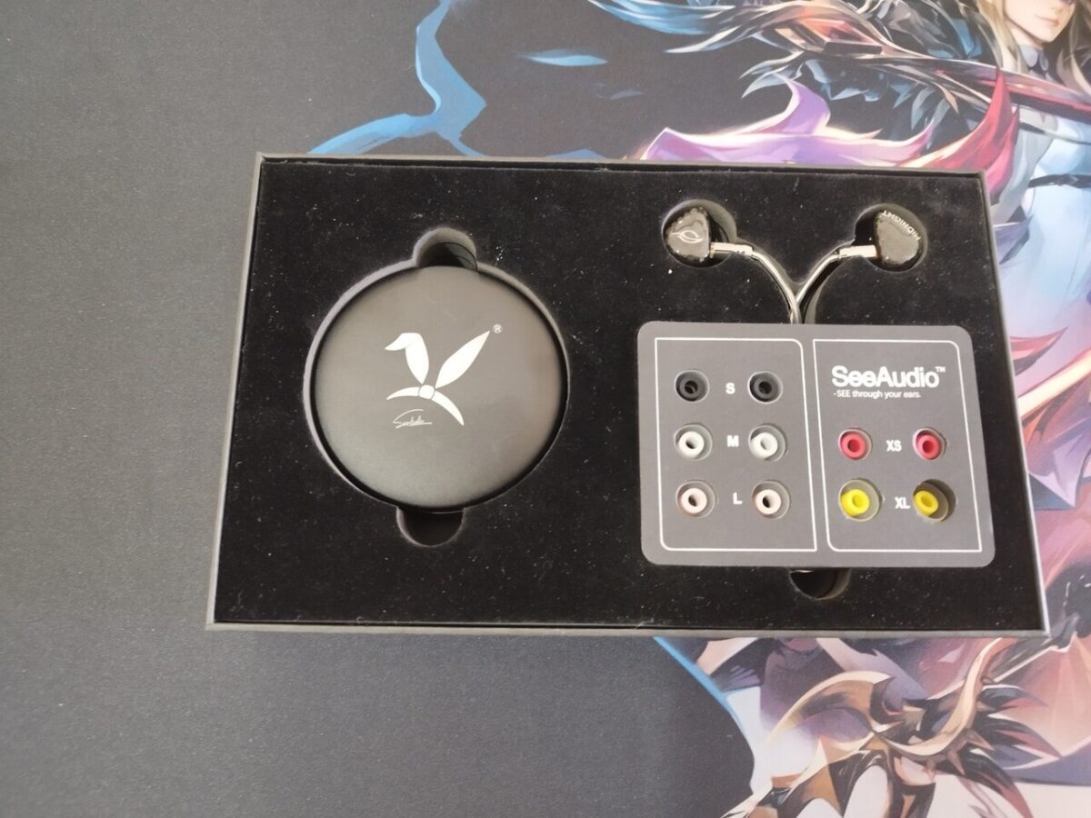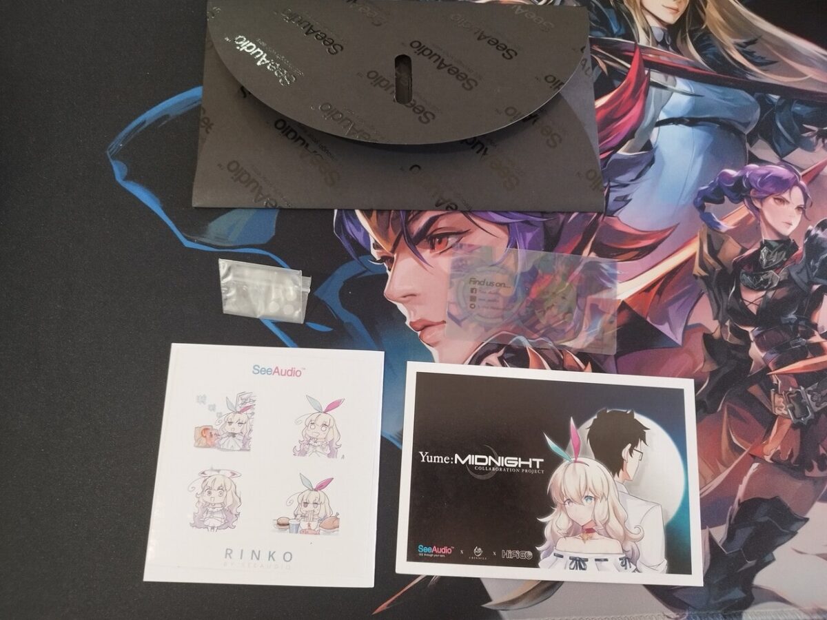 La primera impresión importa demasiado y es algo que See Audio conoce a la perfección, por lo que al retirar la cubierta de protectora nos encontraremos con una caja en color negro con un diseño minimalista que transmite muy bien la sensación de estar ante un producto premium. Al retirar esta caja podemos ver un sobre que dentro de él incluye un manual de guía, unos stickers de la waifu Yume, una postal con la ilustración que encontramos en la portada y una tarjeta de presentación.