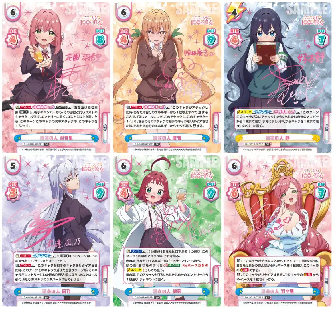 Esta colaboración especial entre «Rebirth For You» y la serie de anime «The 100 Girlfriends Who Really Love You» consistirá en la producción de un juego de cartas que tendrá como protagonistas a los personajes Hakari Hanazono, Karane Inda, Shizuka Yoshimoto, Nano Eiai, Yakuzen Kusuri y Hahari Hanazono, las seis primeras novias del protagonista Rentaro Aijou. A continuación, les presentaremos estas increíbles tarjetas que se pondrán a disposición del público.