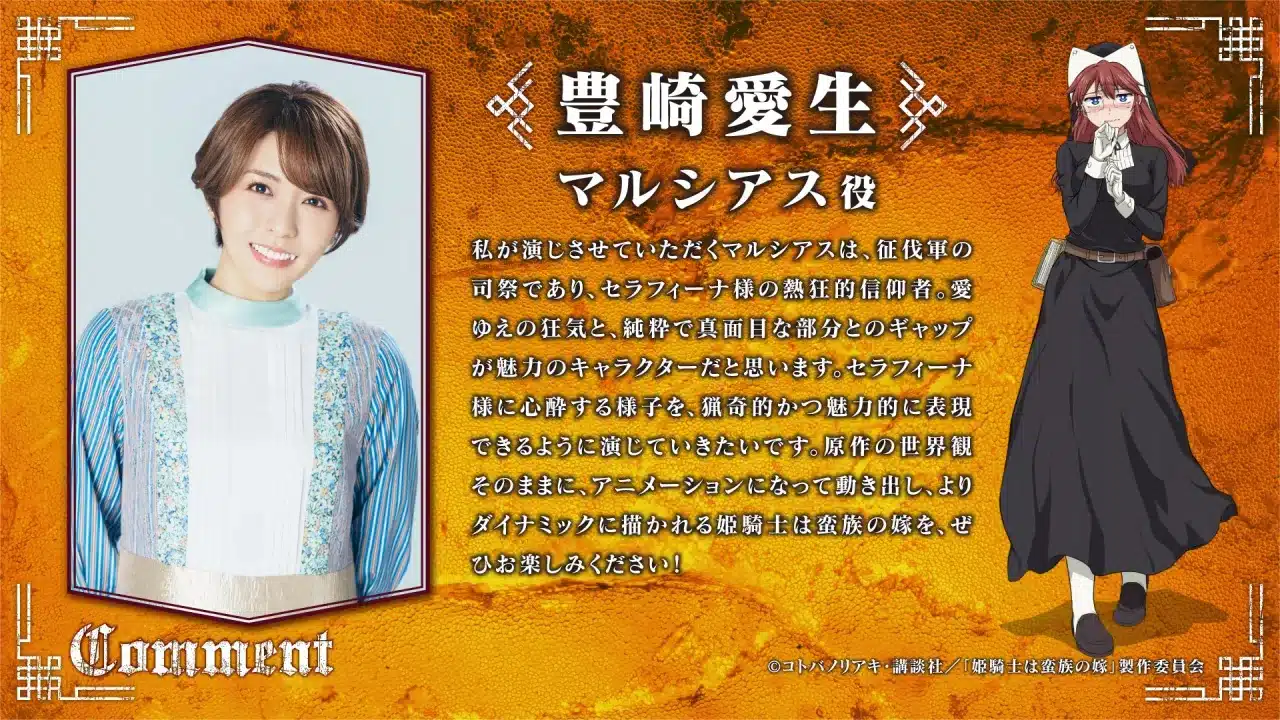 La actriz de voz Aki Toyosaki, conocida por dar voz a Yunyun en Konosuba! y Kazari Uiharu en Toaru Kagaku no Railgun, interpretará a Alyssa Martias