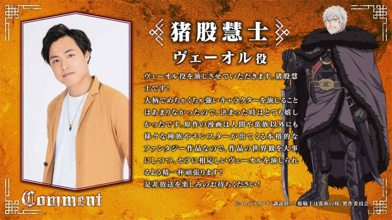 El actor de voz Satoshi Inomata, conocido por interpretar a Shuugo Hoshikawa en Douse, Koishite Shimaunda, dará voz a Veor