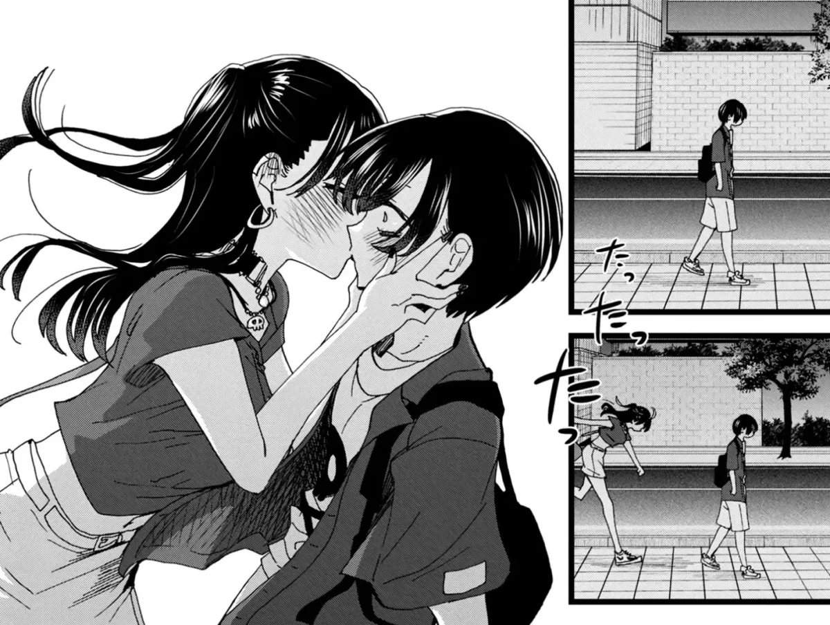 Pues parece que las cosas se van a poner un más interesante, ya que en el reciente capítulo 128 de The Dangers in My Heart nuevamente Ana es quien da un paso al frente y nos vuelve mostrar sus sentimientos hacia Kyotaro situación que se nos muestra con el panel final del capítulo donde ella se despide su chico favorito y mitras él se aleja, en ese momento nuestra waifu se lanza al ataque robándole un beso nuevamente.