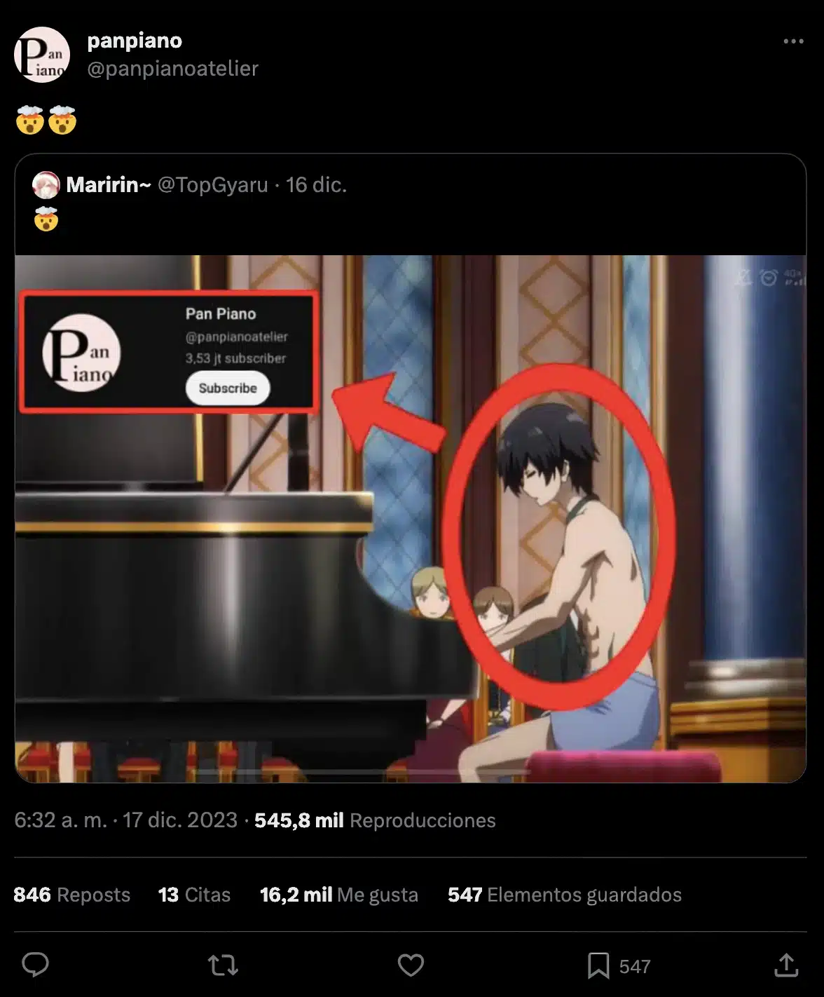 Como vemos en la imagen, Cid estรก tocando el piano en ropa interior mientras que un cรญrculo rojo lo envuelve y nos muestra el perfil de Pan Piano con 3.5 millones de subscriptores, esto haciendo referencia a que si en ยซThe Eminence in Shadowยป existiera YouTube y Cid se abriera un canal tocando en paรฑos menores muy provocativos serรญa un รฉxito igual que Pan Piano en nuestro mundo real.ย Este meme se ha vuelto bastante viral causando muchas reacciones entre los otakus de X, pues muchos han comentado que efectivamente Cid es Pan Piano en otro universo, otros mรกs han comentado que si ellos estuvieran en el mundo del anime definitivamente se suscribirรญan al canal de Cid.