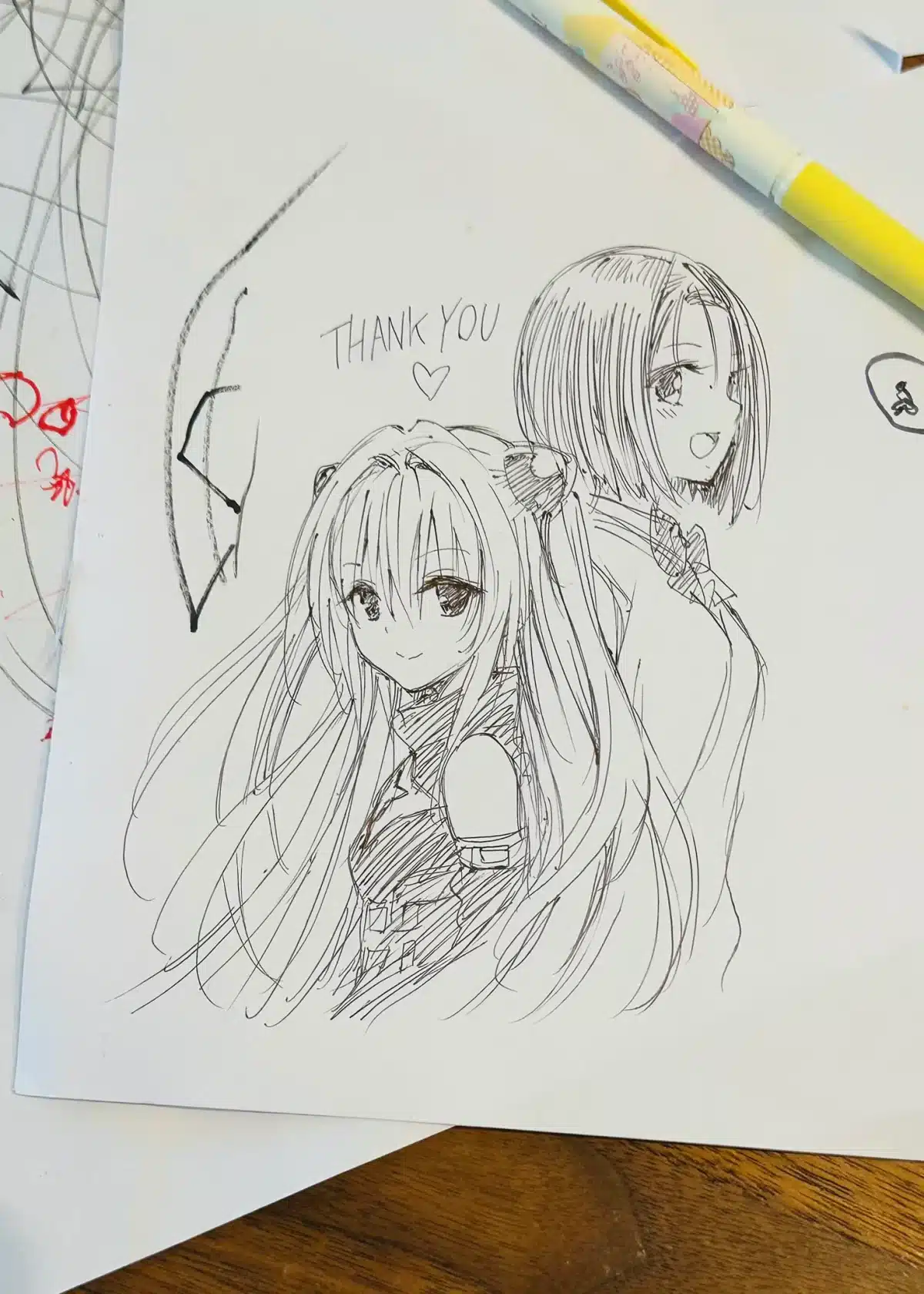 Y es que a través de su cuenta de Twitter/X, el artista realizó un pequeño boceto donde vemos a Yami y Haruna Sairenji, dibujadas en este caso de manera que podría parecer simple, pero que mantiene toda la esencia de la obra original, algo que se esperaría de una mano tan hábil como la de Yabuki. Además, el ilustrador se mostró muy emocionado de volver a ver juntos a los seiyuus que trabajaron en To Love-Ru, y aunque ya pasó un tiempo desde que oyó sobre alguna noticia de la obra, no perdió la oportunidad de agradecer.