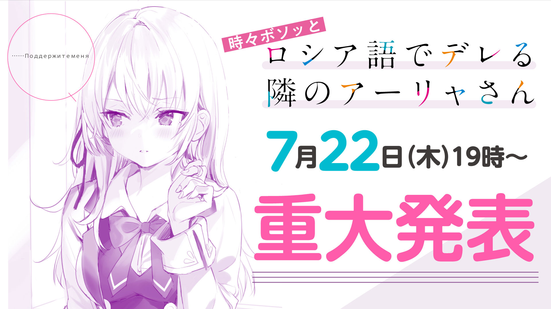 Nuevas noticias sobre la waifu Rusa se acercan, y es que a través del Twitter oficial para la novela ligera Tokidoki Bosotto Roshia-Go de Dereru Tonari no Arya-San (RoshiDere), se anunció que el próximo 22 de julio, la obra tendrá un anuncio importante.
