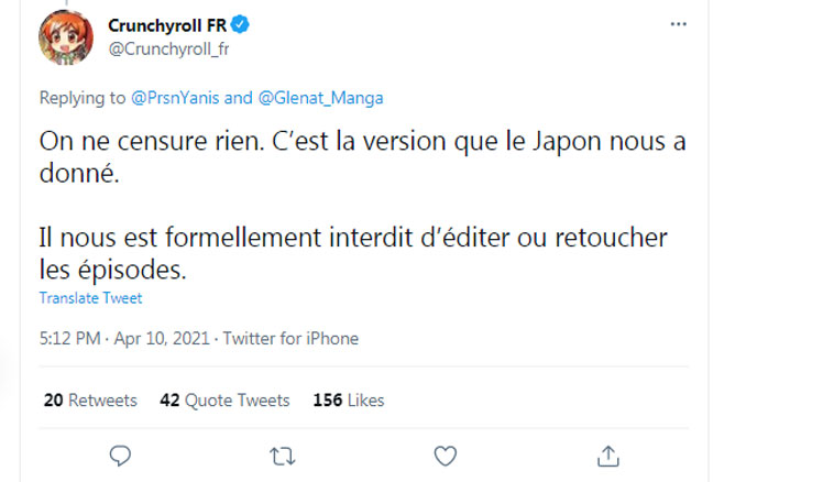 Pues bien, ahora la situación es que la plataforma de Streaming Crunchyroll (Quien emite el anime de manera legal) se encontró con las quejas de las personas por la escena censurada en el séptimo episodio de la serie. Es por eso que la cuenta de Twitter oficial de Crunchyroll Francia hizo un comentario sobre esto.