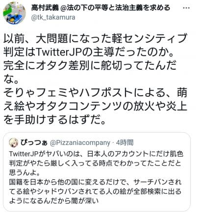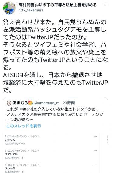 «Recibí respuesta. ¿Fue Twitter Japón quien lideró las manifestaciones de hashtags activistas de izquierda sobre el Partido Liberal Democrático? Esto significaría que Twitter Japón también fue responsable de incitar las críticas hacia las ilustraciones moe por parte de las feministas, sociólogos, HuffPost, entre otros. Twitter Japón también habría sido responsable del colapso de ATSUGI (compañía de medias para mujeres) y su retirada de Japón, lo que supuso un duro golpe para la economía local».