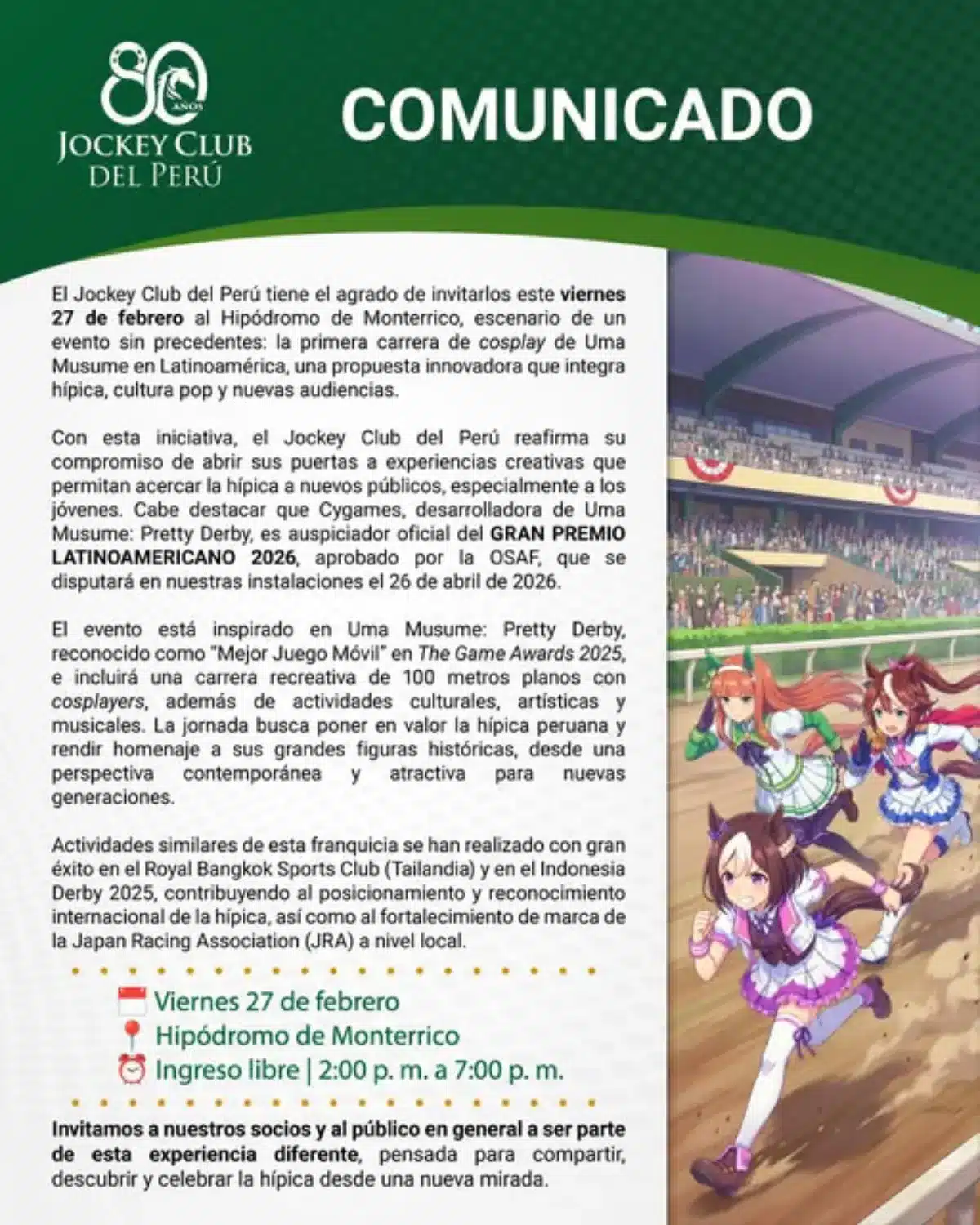 La carrera de cosplay de Umamusume en Lima es un movimiento brillante del Jockey Club del Perú para refrescar el interés por la hípica en las nuevas generaciones.