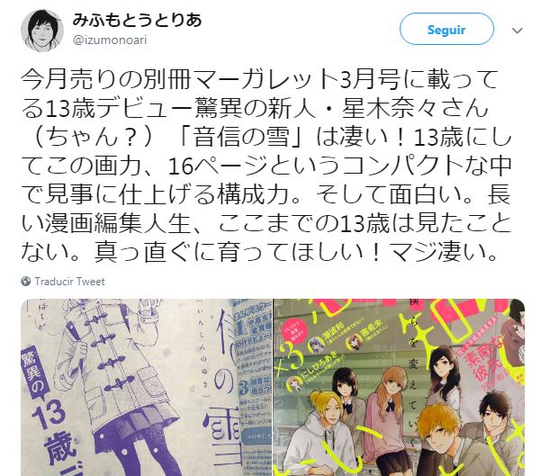 Por medio de Twitter, Tomofumi Arito comento «En mi larga vida como editor de manga, nunca había visto a una chica de 13 años como ella. Es verdaderamente increíble».