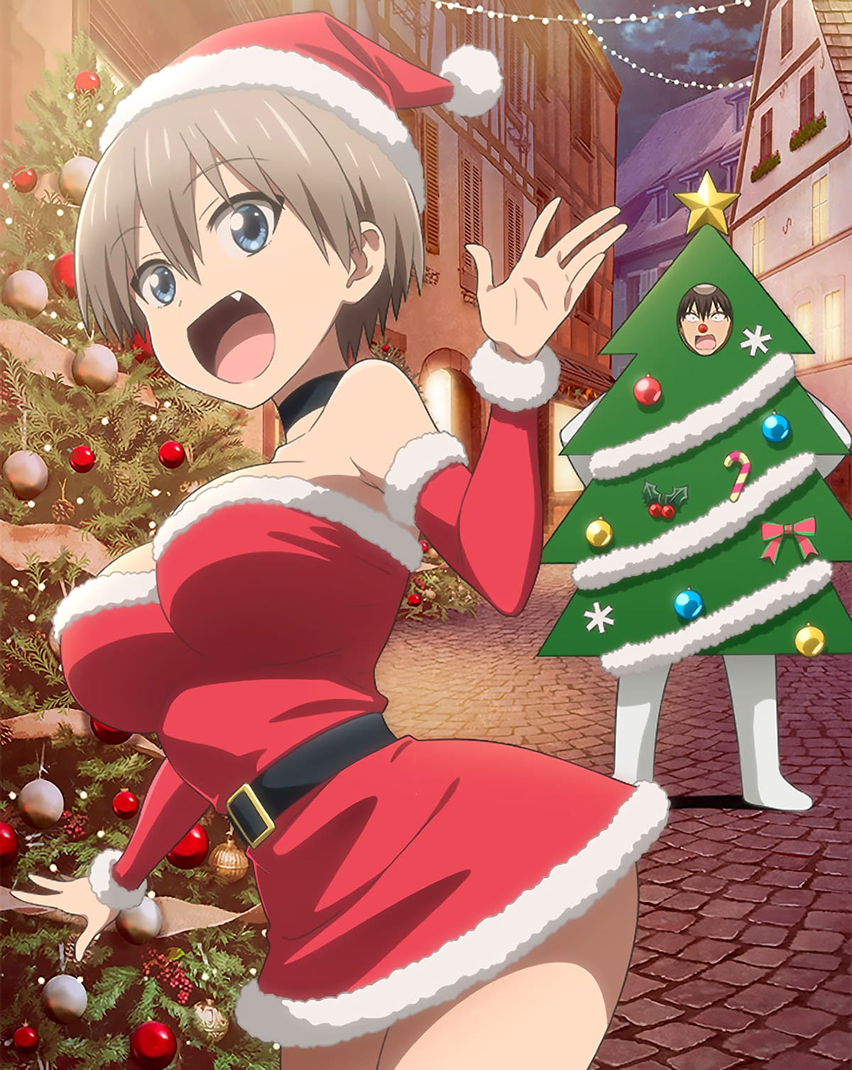 Sin embargo, hay una portada que ha llamado la atención de las personas, y es que en una de ellas podremos ver al personaje Hana Uzaki lucir un pequeño traje de navidad para la ocasión. Para formar la adorable pareja, Shinichi Sakurai también estará presenta en la portada y estará disfrazado de un caricaturesco árbol de navidad.