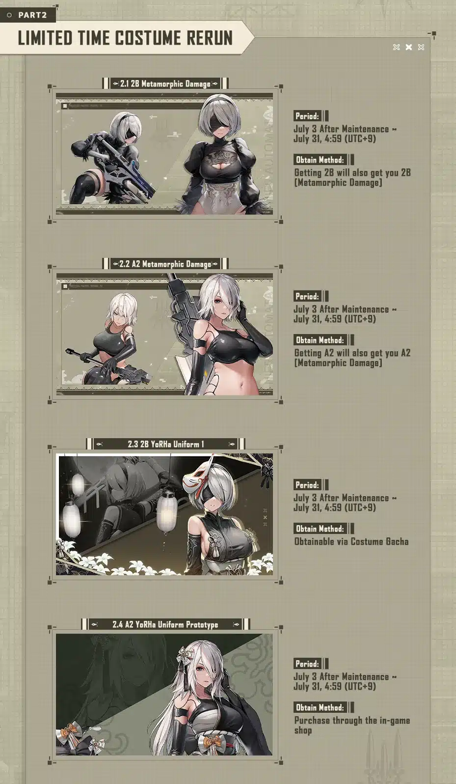 - Traje de A2 (YoRHa Uniform Prototype): disponible en la Cash Shop del 3 al 31 de julio.