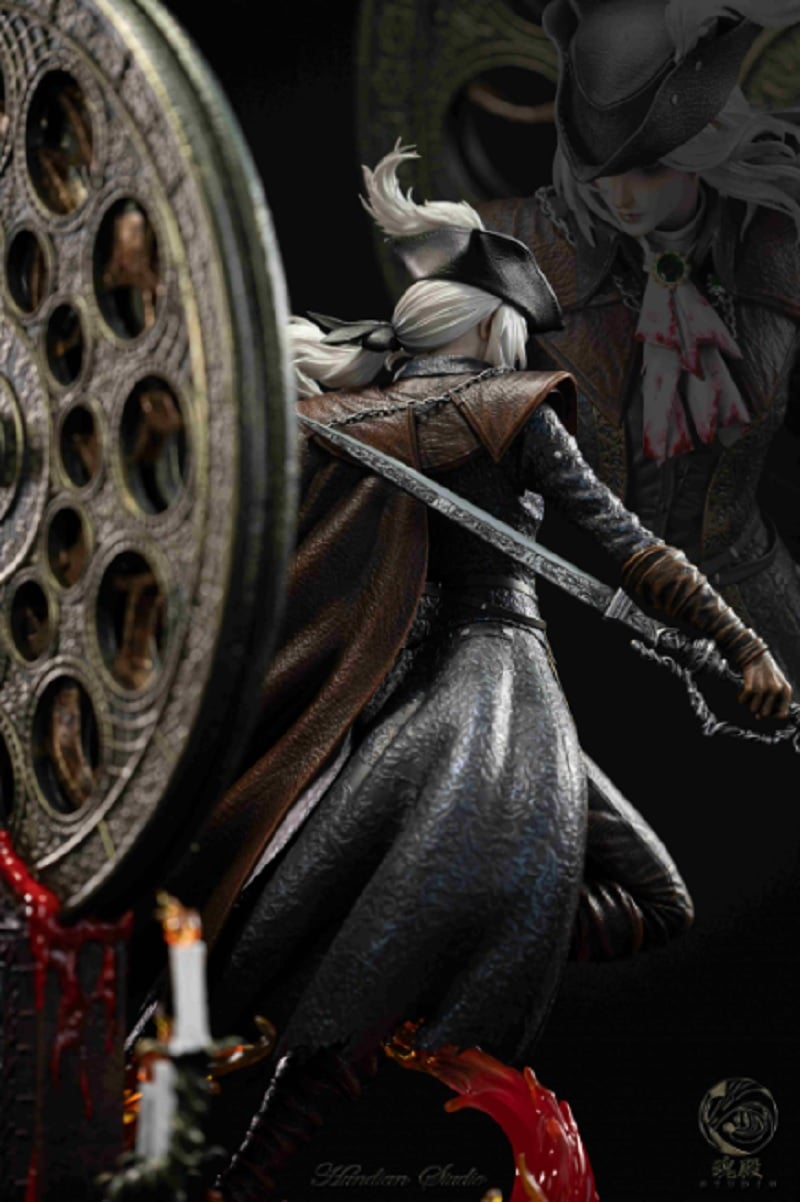 Como podemos ver, se ha optado por representar a Lady Maria portando el arma que utiliza en combate, la Rakuyo, además, puede acompañar los cortes y ataques de su arma utilizando sangre, elemento clave en muchos de los aspectos de Bloodborne y que tiene presencia también en la figura.