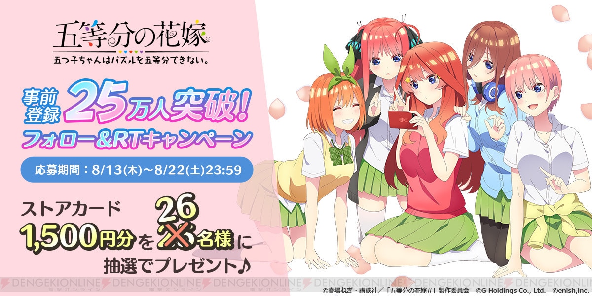 El portal Dengeki Online reveló que el videojuego para smartphones Go-Toubun no Hanayome – Itsutsu-ko-chan wa Puzzle wo Go-Toubun Dekinai, inspirado en la adaptación al anime del manga Go-Toubun no Hanayome, acaba de superar la cifra de los 250 mil usuarios pre-registrados.