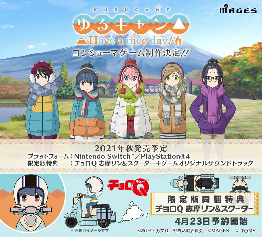 La compañía desarrolladora de videojuegos Mages reveló que el nuevo videojuego inspirado en la adaptación al anime del manga Yuru Camp (Laid-Back Camp), titulado Yurucamp Have a Nice Day!, saldrá a la venta en Japón para Playstation 4 y Nintendo Switch este otoño.
