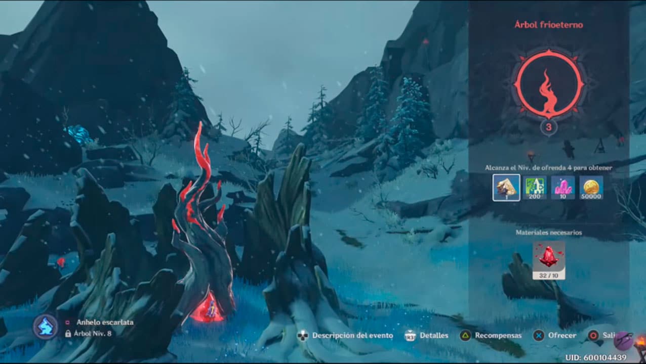 - Al explorar Espinadragón, es posible encontrar cristales de ágatas escarlata. Puedes recogerlas para ascender tu nivel de ofrenda en el Árbol frioeterno y obtener Encuentros del destino, Destinos entrelazados, Planeadores, Mora, EXP de arma, EXP de personajes, materiales de mejora de talentos, planos para fabricar artilugios, entre otras recompensas. Conforme recibe ofrendas y crece, la sed de poder del Árbol frioeterno será mayor. A través de las raíces que se extienden por todo Espinadragón, puede descubrir más ágatas escarlata cuando aparezcan periodicamente fuera de las líneas ley.¡Escucha sus anhelos y recolecta ágatas escarlata dispersas en la montaña nevada!