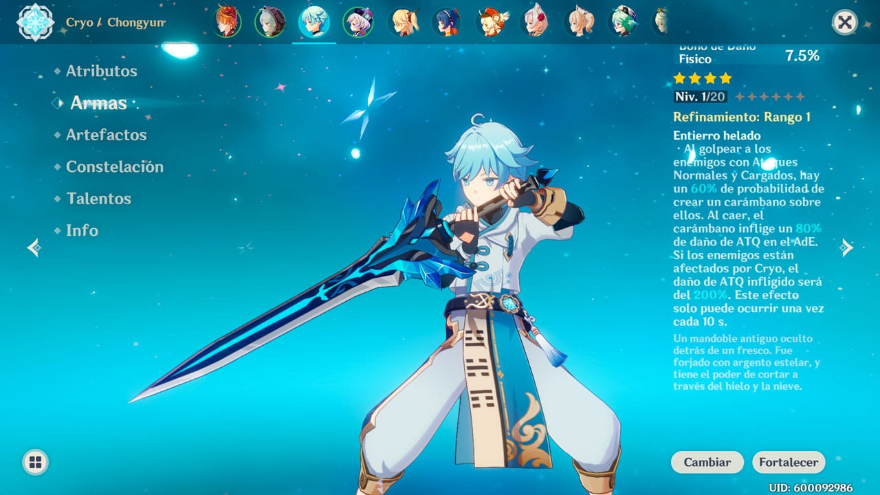 - Tercera actualización: Cuando el personaje obtiene un Fragmento Elemental Cryo producto de la Cristalización de Geo y Cryo, la Prob. CRIT aumenta en un 8%. Este efecto dura 20 s y se puede acumular hasta 5 veces.