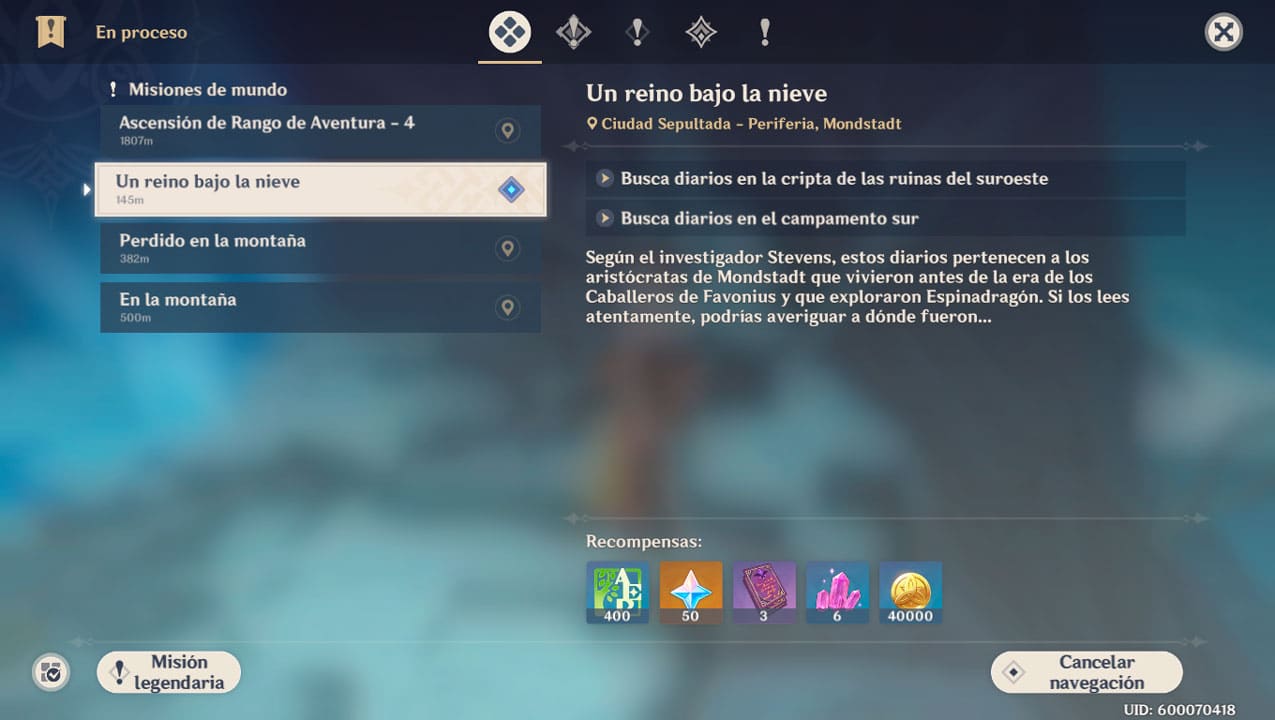 - ¡Al completar las misiones podrás obtener Mora, EXP de Personaje, materiales y otras recompensas!
