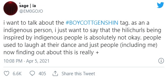 Quiero hablar del hashtag #BOYCOTTGENSHIN. Como indígena, sólo quiero decir que el hecho de que los hilichurls se inspiran en los indígenas no está para nada bien. La gente solía reírse de su baile y el hecho de que la gente (incluida yo) se entere ahora de esto es realmente doloroso.