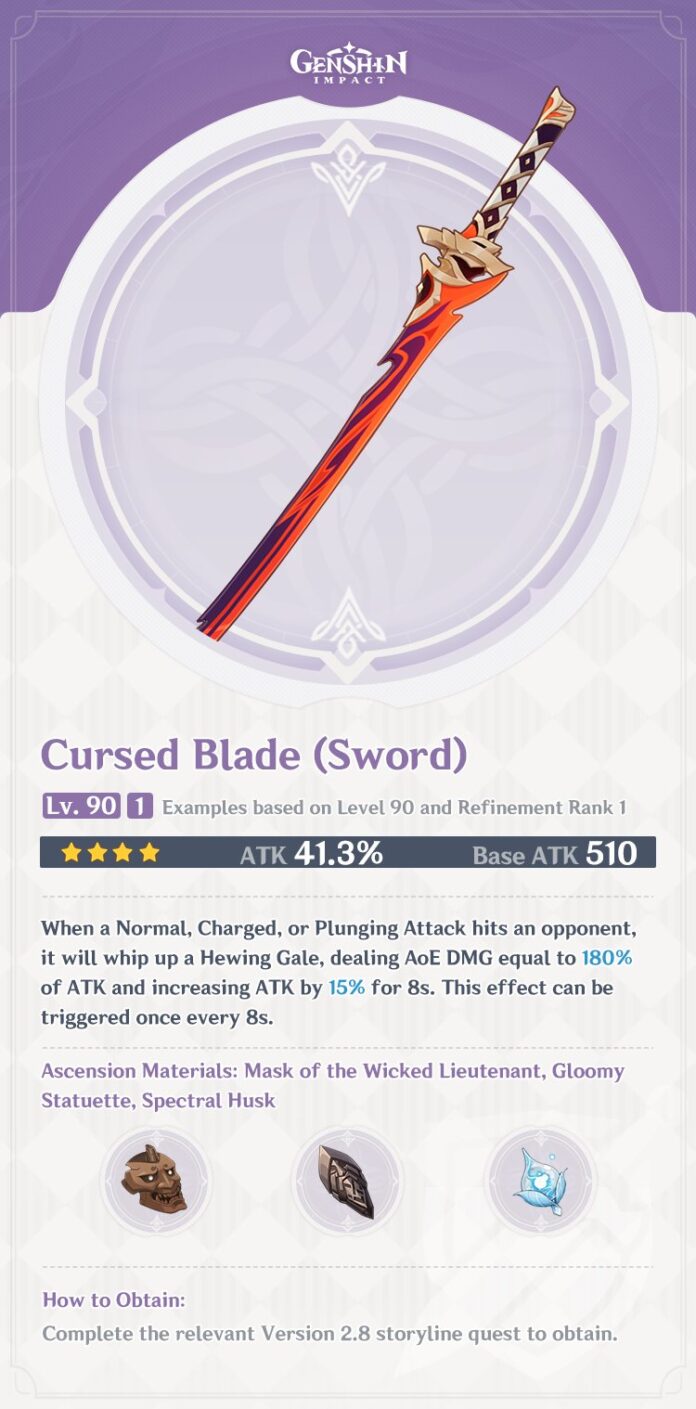 La actualizaciรณn 2.8 de Genshin Impact nombrada como โSummer Fantasรญaโ, introducirรก una nueva espada llamada โthe Cursed Bladeโ. Es una espada de 4 estrellas que tiene como estadรญstica principal el ataque. Esta nueva arma estarรก disponible en las nuevas misiones de historia.