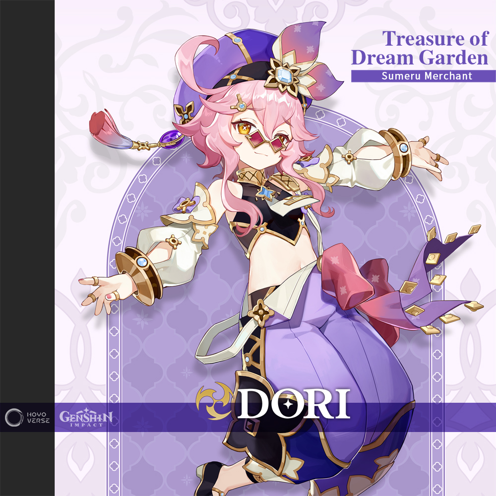 Dori, el รบltimo personaje en ser revelado, es descrita como โimpredecible y escurridizaโ, y es โla comerciante mรกs โingeniosaโ de Sumeru, tiene una manera de conseguirte todo lo que necesitas, ya sean gemas preciosas, hierbas raras y artรญculos exรณticos de los que nadie ha oรญdo hablarโ. La percepciรณn que tiene la gente sobre ella, es que โes una comerciante sin escrรบpulos que se aprovecha de la situaciรณnโ.