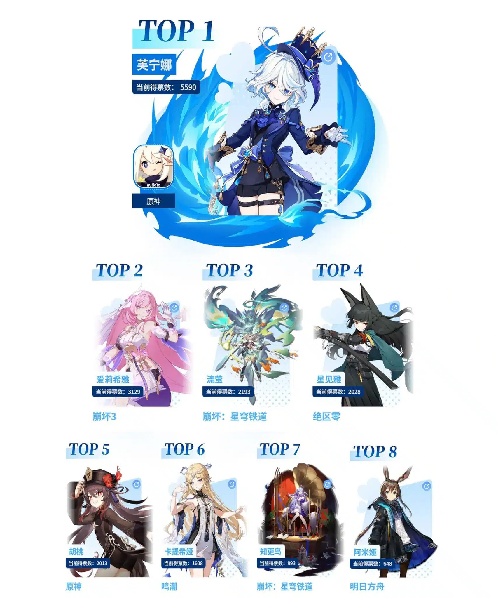 Y es que como se puede ver, HoYoverse es la empresa que más chicas posee en la lista, donde en 6 de los primeros 8 puestos pertenecen a algunos de sus juegos. Por su parte, además de Furina vemos a Hu Tao representando a Genshin Impact. Honkai Star Rail tampoco se quedó atrás, y dos de sus “waifus” se encuentran en la lista, Firefly y Robin. Para cerrar con la lista de juegos de HoYoverse, Miyabi de Zenless Zone Zero se colocó en el cuarto puesto. Entre otros de los nombres del top ocho tenemos a Cartethyia de Wuthering Waves en el puesto 6 y Amiya de Arknights en el octavo lugar.