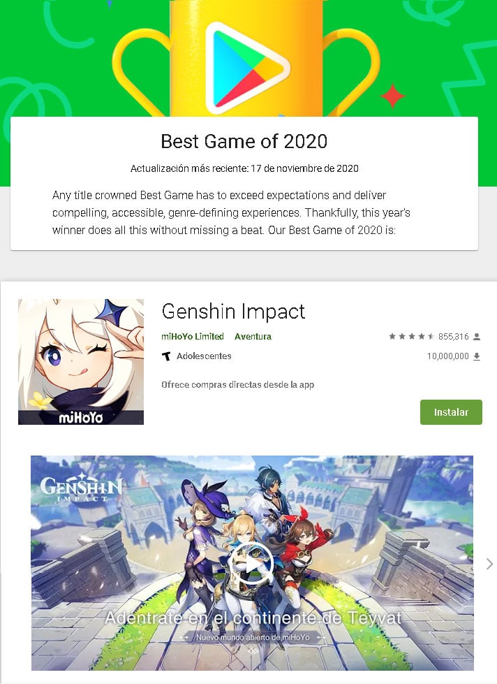 El videojuego de acciรณn ARPG de mundo abierto free-to-play con una mecรกnica de monetizaciรณn de Gachapรณn recibiรณ el premio al mejor juego de mรณviles del aรฑo 2020.