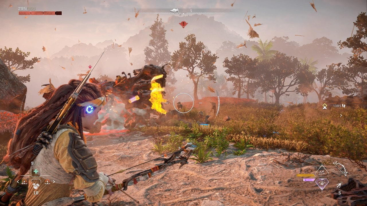 Una vez completado esta especie de prólogo, Horizon nos permite explorar un extenso mundo abierto que pese a seguir conceptos tradicionales del género, destaca por tener una base sólida que permite al jugador perderse durante horas sin llegar a sentirse repetitivo. De hecho, la gran variedad de máquinas y las misiones secundarias tan bien cuidadas hacen que el jugador se pierda inconscientemente mientras intenta completar el juego. Durante mis sesiones de juego, fue inevitable perderme durante 3-5 horas en farmear materiales para mejorar mis armas o realizar ciertas tareas que llamaron mi atención.