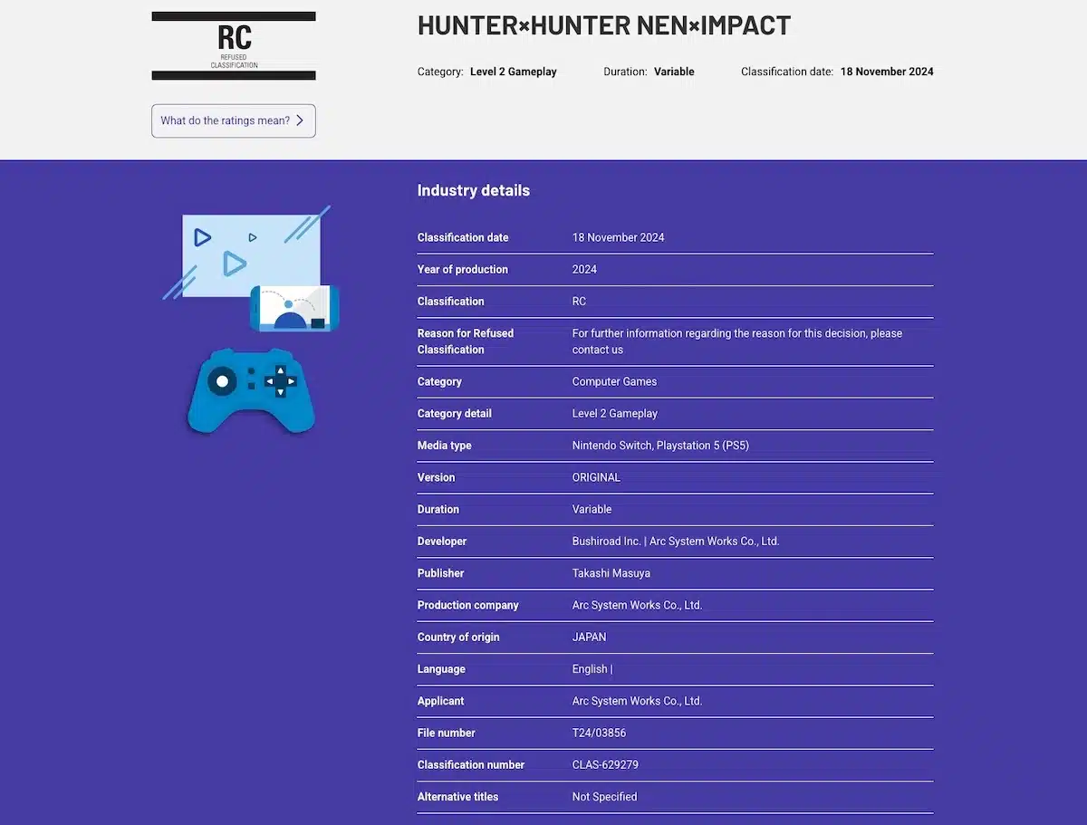 El videojuego Hunter x Hunter: Nen x Impact, desarrollado por Bushiroad, ha dado de que hablar entre la comunidad gamer, tras la decisiรณn del organismo de clasificaciรณn australiano de no otorgarle una clasificaciรณn de edad, lo que implica que no podrรก ser vendido ni distribuido legalmente en Australia. Este tรญtulo, basado en el universo del manga y anime creado por Yoshihiro Togashi, promete combates emocionantes con una narrativa fiel al material original y estaba previsto inicialmente para 2024, pero su lanzamiento fue retrasado a 2025 para perfeccionar el sistema de netcode rollback, una funciรณn clave para optimizar el juego en lรญnea.